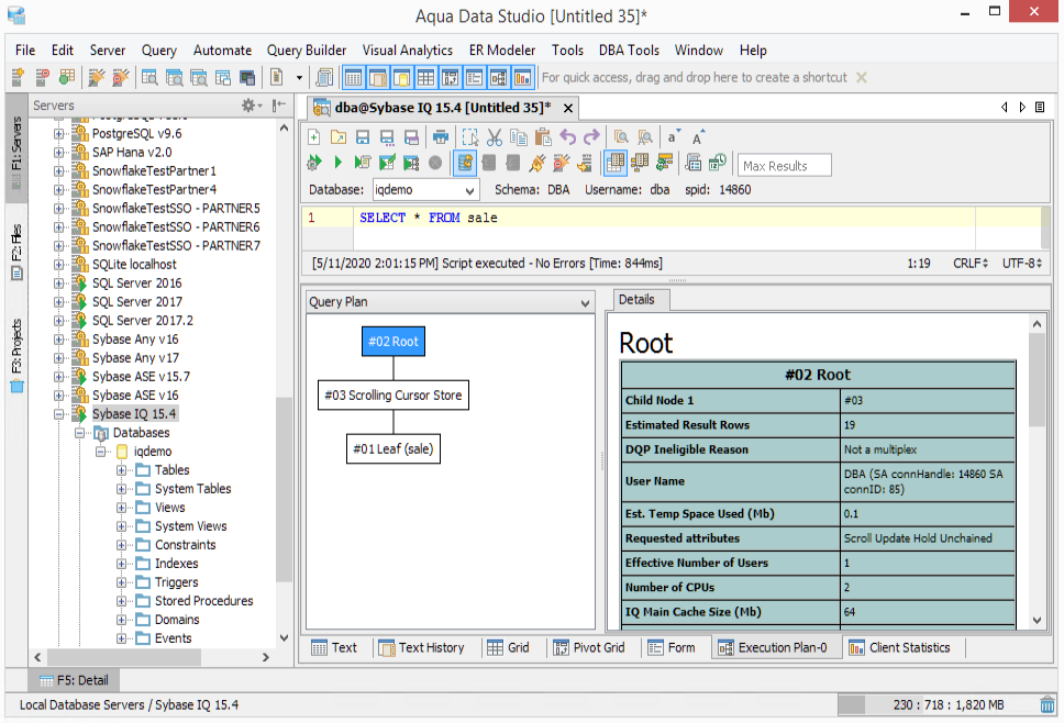 Execution Plan for Sybase IQ 15.x and Sybase IQ 16.0 When executing a query it is possible to view Execution Plans for Sybase IQ 15.x and Sybase IQ 16.0. Once the query executes and the Execution Plan Results Tab is viewed, there are three possibilities for viewing: