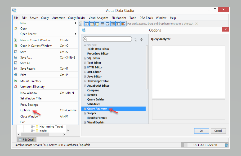Within the Query Analyzer, there is a drop-down menu for picking other databases on the currently connected server. Multiple Query Analyzers can be open at the same time in different tabs or within additional free-floating Query Analyzer windows. Editing Properties of a Query Analyzer in Aqua Data Studio The properties of the Query Analyzer can be viewed and altered by selecting File > Options > Query Analyzer from the main menu. There are defaults set for the Query Analyzer in the Options Dialog, depending on the database vendor and version chosen. The preset defaults for each vendor and version have been selected based on previous user experience and supporting database documentation.