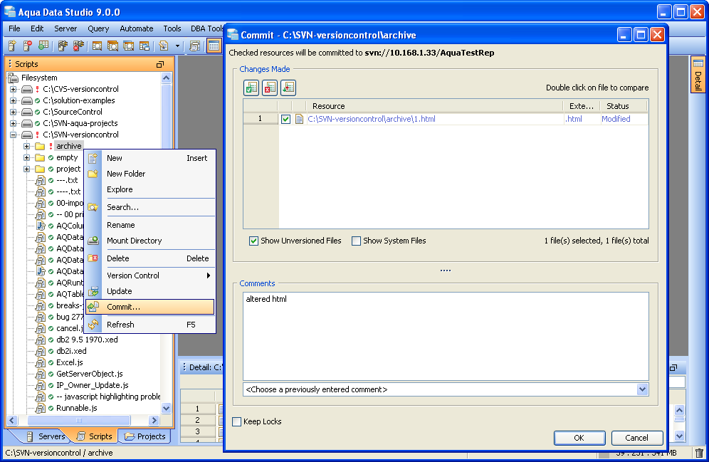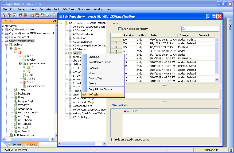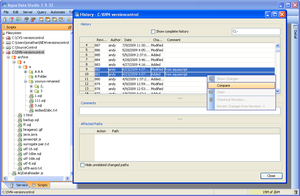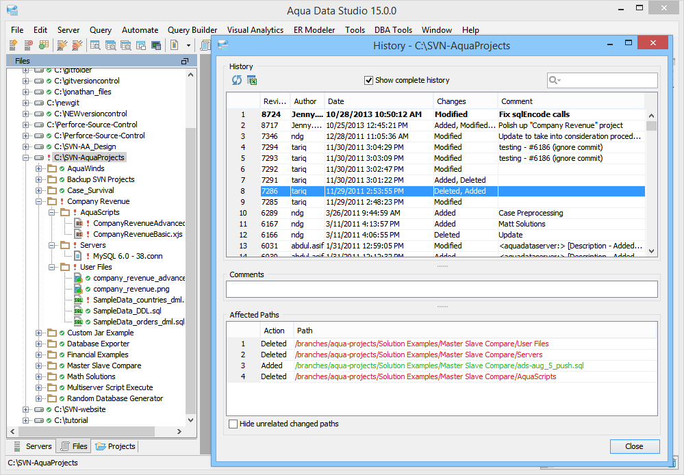 How to update a Version Control file or repository Within the scripts pane, right click on a repository, directory or file and select Update. This will retrieve the latest version from the remote repository. How to add a file to Version Control Within the scripts pane, left click on a file, files or directory to select, then right click to select "Add". This will include the selection in the repository for versioning. How to delete a file in Version Control Within the scripts pane, left click on a file, files or directory to select, then right click and navigate to "Version Control" to select "Delete". This will delete the selection from the repository. Within the Repository Browser, right clicking on an item and selecting Delete functions the same way. How to revert a file in Version Control Within the scripts pane, left click on a file, files or directory to select, then right click and navigate to "Version Control" to select "Revert". This will revert the selection in the repository. How to Show History in Version Control Within the scripts pane, left click on a file, files or directory to select, then right click and navigate to "Version Control" to select "Show History...". This will display the Version Control history of the selection in the repository. Within the Repository Browser, expanding the tree to select the file or directory you wish to view the history on, then left clicking it brings up its history in the History Table. The history displayed in the Repository Browser and the history displayed when selecting Version Control->Show History work similarly. Show History Dialog (window) Right clicking on a versioned item in the Files Browser gives direct access to show the history of that item. The resulting Show History dialog provides a list of all of the version control actions on a file or directory, and the revision's contained files. By default, the Show History Dialog only shows the most recent changes. If the "Show Complete History" option is enabled, all of the actions taken since the creation of the repository will be listed. Each action can be inspected in a table with columns for Revision, Author, Date, Changes and Comments. Two items in this history can be selected and compared to show the differences in actions and content over time. An item in the history can also be selected to "show changes" in the file as a comparison to its previous revision. Once a revision is identified within the History, right clicking on it also allows a checkout of that specific revision or a revert to that specific revision. At the bottom of the Show History is an area displaying affected paths of a revision, with an option for hiding unrelated changed paths. The Subversion (SVN) Repository Browser is a convenient way to view all of the contents of a repository, even when no working copies have been mounted locally. While the Repository Browser shows details on item history, it does not show the status of local working versions. It is more for exploring the remote repository and its contents than managing the local versions of files. To Launch the Repository Browser, right click on an item in the Files Browser and select Version Control -> Browse Repository. A window appears with the url to the repository in its title. An expandable tree view appears on the left and a history for the selected items in the tree appears on the right. The Subversion (SVN) Repository Browser points to the repository root when launched and offers an in-depth, explorable view of all of the files in a repository without requiring a local version of its content. The repository is displayed as a tree where action can be taken on individual items, or they can simply be viewed. The History table within the Repository Browser allows opening and comparing of individual items by way of a popup menu. Tree content is obtained with a background thread so that Aqua Data Studio’s other tools can be used while information from the repository is being retrieved. In the Affected Paths display, unrelated changed paths can be hidden. Inside the tree, right clicking on items allows checkout, new remote folder, rename, move, branch, delete, copy url and refresh. The Browse Repository menu item invokes the browser, pointing to the repository root, showing a tree, history table, and a "show complete history" checkbox for viewing the complete history of items in the repository. Clicking on item in the history table can also shows affected paths when it is enabled. Repository Browser Tree popup menu Right clicking within the repository browser launches a menu with checkout, new remote folder, rename, move, branch, delete, copy url, and refresh menu options. Repository Browser History Table and popup menu The Repository Browser History contains much of the functionality of the Show History Dialog mentioned above. Clicking on items within the Repository Browser History Table brings up menu options for show changes, compare, open, compare with revision, compare repository revisions. The history content is obtained in a background thread, allowing Aqua Data Studio's other operations to continue uninterrupted. Additional Subversion features