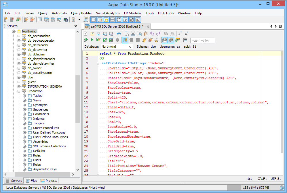Query analyzer scripts have support for 9 client side commands which allow you to execute a stored procedure with local variables bound to the parameters. See the AquaScripts and AquaProjects Section for much more complex scripting capabilities. This allows for the execution of procedures with OUT parameters. The commands include print, println, variable, executeCallableQuery, sendMail, saveResults, saveLastResult, setResultSettings, and setPivotResultSettings. Client side commands are identified by a dot at the beginning of the command line, and multiple commands can be executed within one batch statement. The schema browser contains object scripting for procedures and functions that include "EXECUTE" and "EXECUTE BIND". The script EXECUTE will generate the appropriate code needed to execute the object according to the database procedural language (ie. PL/SQL, T-SQL). The EXECUTE BIND will generate the appropriate Aqua Data Studio client side commands to execute the object. To easily generate the needed client commands to execute a procedure or function, you may browse in the schema browser to locate the procedure or function and right-click on the object to select "EXECUTE BIND" from the Script Object menus. Command support Query Analyzer scripts have support for client side commands ".sendMail", ".saveResults", ".saveLastResult", "setResultSettings", "setPivotResultSettings" which allow users to either save query results in an EXCEL, HTML, XML, or CSV document, or insert them into a table. The 'sendMail' command sends emails using the settings you specify and allows attachments. The 'saveResults' command saves the results of all of the queries in the window, while the 'saveLastResult' command only saves the result for the last query. The 'setResultSettings' command lays out how grid data will be presented. The 'setPivotResultSettings' command lays out how pivot grid data will be presented. Here is a combination example script using .setPivotResultSettings, .saveResults, and .sendMail which runs a query, takes data from that query, lays out, and generates a pivot grid result, saves the pivot grid results to two different Excel files, then emails a message with both Excel files as attachments.