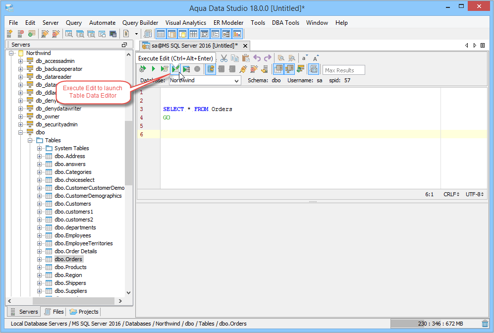 Aqua Data Studio provides a Table Data Editor which allows a user to graphically edit the resultset of an executed query on a table, including its data and rows. The editable result set is displayed in an Excel like grid. To activate a table editor you must either right click on a table in the Schema Browser and select "Edit Table Data (Top 1000)" or write a table SELECT statement and use the "Execute Edit" button. This will execute the query and return the resultset in a new Table Editor window. From this window a user may edit and save the contents of the resultset. The editor uses the primary key or any unique constraint to identify the row in the result which it will generate UPDATE statements for. If your resultset doesn’t have a primary key or unique constraint, you will be prompted to define a primary key in the primary key tab. A check mark indicates which column(s) participate in the primary key. There is an option within File->Options->Permissions to allow Primary Key Definition Changes. Table Data Editor Workspace Like the other tools of Aqua Data Studio, the Table Data Editor is part of the Application Docking Framework. The window for the Table Data Editor can remain open as other tools in Aqua Data Studio are used. The Table Data Editor's menus and icons are taken directly from the Main Application Toolbar. Their functionality for refreshing and reconnecting to database servers has been included to make it easier to reconnect and refresh table data without having to access the Main Application Menus and Toolbar. At the top are the File, Edit and Window menus. Below are Toolbar icons for Refresh, Reconnect, Save and Refresh, Save and Close, Save Script ("Save Script" stores the chosen directory path and uses it for subsequent save operations as a default directory for easier navigation), Stop, Add Row Above, Add Row Below, Clone Selected Row(s), Clear All Changes, Clear Selected Deleted Rows, Clear Changes in Selected Cells, Set Cells to Null, INSERT Current Date and Time, INSERT Current Date Only, Edit in Window, Close Window, Max Results, Aggregate Functions (when enabled) and Quick Filter. Below the Toolbar Icons are the tabs for Table Data, Primary Key, Preview SQL and Messages. The Window menu can be used to cycle through tabs when so many exist it is difficult know which one was focus via Window->Next Tab; Window->Previous Tab; Window->Focus Max Results. The layout of the data within the Table Data tab functions similar to a spreadsheet appliction, with the ability to insert rows and cells where desired via Find and Replace when needed. Most of the work done in the Table Data Editor occurs in the Table Data tab, which displays the data for the table(s) from the select statement used in the Execute Edit mentioned earlier. Row color and bolding assist in displaying recent changes and nulls in the data, and appear in the Table Data Editor modification logs (when enabled in File->Options->Table Editor->Modification Logs). A box appears around the content inside of a selected cell to identify content length where blank spaces may appear before text, but not be visible. Table Columns, must be added or removed from tables via context menus with right clicks in the Schema Browser or through the Query Analyzer by way of database commands. Using Edit->Format: AutoFit Column Width, cells can be highlighted and resized automatically using the menu, a key shortcut, or a double-click on the right border of the column header. This option can be configured from the dropdown menu. The Primary Key tab displays a list of all of the columns relating to the tables in the query used to launch the Table Data Editor via the Execute Edit command from the Query Analyzer. If more than one table was used in the query, a dialog appears to choose the primary keys and an additional Primary Key tab will display for each table with schema information in the tab title. The Preview SQL tab displays the DDL used to perform the edits made within the Table Data Editor with appropriate Syntax highlighting. The Messages tab displays any warnings or messages during table data modification. At the bottom of the Table Data Editor window are the Preview Panel (when enabled) and Status Bar. The Preview Panel creates a cell's preview in a split panel to allow the user to preview the currently selected value in the grid. This helps the display the full value of a narrow cell, including long string values or CLOB values. The Status Bar contains Pattern information to show the data type and range of selected cells at the bottom left, and Total Rows of the table at bottom right. After the changes are saved and the table is refreshed (Save and Refresh), the cursor selects the first cell of the selected row before save. When closing a modified window the application will prompt for "Save," "Discard" and "Cancel." Visual Editing The Table Data Editor allows you to add, edit and delete rows and changes in the editor are color coded so that you may see your changes before commiting them. Inserted/Modified/Deleted rows have light blue cell background. Modified cells have a slightly darker color for the text so it allows the user to see spaces. Cells in Inserted Rows also have the background color of the text shaded to identify invisible characters.