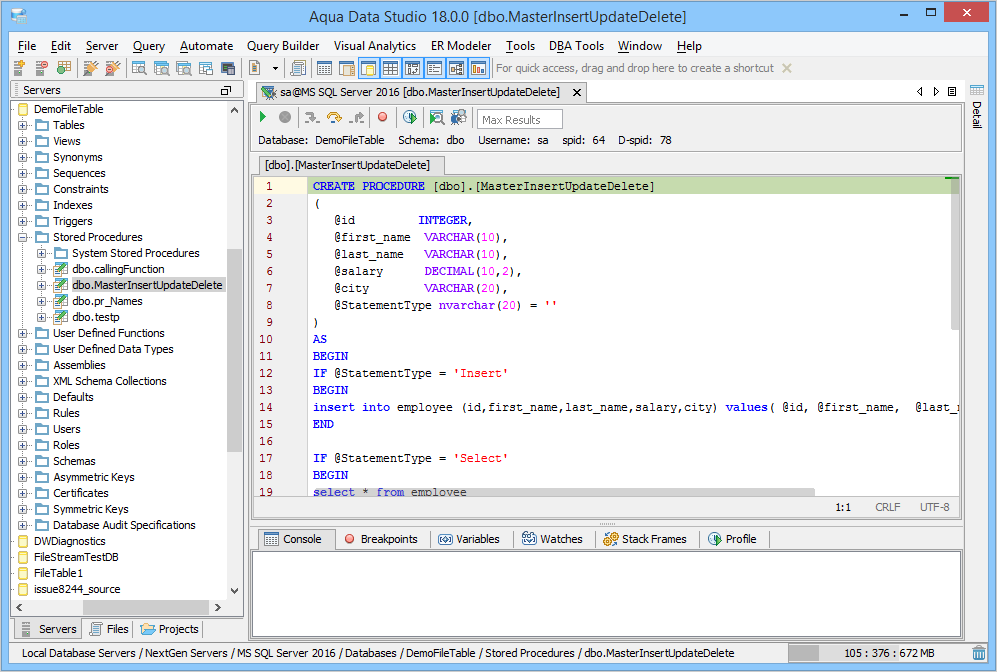 The MS SQL Server SQL Debugger has been designed to help with testing and debugging of SQL functions and procedures for MS SQL Server. It works with MS SQL Server version 2005 and above. Launching the Microsoft SQL Server SQL Debugger The Microsoft SQL Server SQL Debugger is launched through a right click in the Schema Browser on Stored Procedures or User Defined Functions and selecting Debug from the popup menu. More than one debugger can be open at once, with each object to be debugged opened in a separate tab. Debugger Workspace The debugger displays a slightly modified version of the Query Analyzer Toolbar containing debugger specific menus and buttons. Along the top of the debugger are the Execute, Stop, Step Into, Step Over, Step Return, Toggle Breakpoint, Turn On Profiling, Target Query Window, Debugger Query Window buttons. Next to the buttons is the Display Max Results input field. Beneath the buttons is the connection information, username and SID information. The procedure or package displays in the debugging window, within which breakpoints can be added by right clicking and selecting "Toggle Breakpoint" from the popup menu. When this window has focus, and a line has been clicked, it is also possible to select "Run to Cursor," to run the debugger up to that line in the procedure. From the same popup menu, "Go to Current Line" brings the cursor to the current line, which is very useful when debugging multiple lengthy procedures. Below the debugger window are tabs for Console, Breakpoints, Variables, Watches, Stack Frames and Profile. The Console tab displays any errors or messages generated as debugging progresses. The Breakpoints tab indicates the lines of the procedure where breakpoints are set and allows them to stop execution or not. The Variables tab lists any variables by name, their value and type. The Watches tab allows selecting specific variables to be observed as they change, reducing from a possible list of hundreds to a select group. The Stack Frames tab lists the local variables of the functions, and the arguments to them. The Profile tab lists commonly used terms or values a user works with on a regular basis in the debugging process. Once execution of a procedure has begun through the use of the Start button at the top of the debugger window, the bottom left of the window is occupied by the Text, Text History, Grid, and Pivot Grid Results tabs. This area functions just as the Query Analyzer window does, revealing the results of procedures at each breakpoint or execution cursor. The Microsoft SQL Server Debugger features include:
