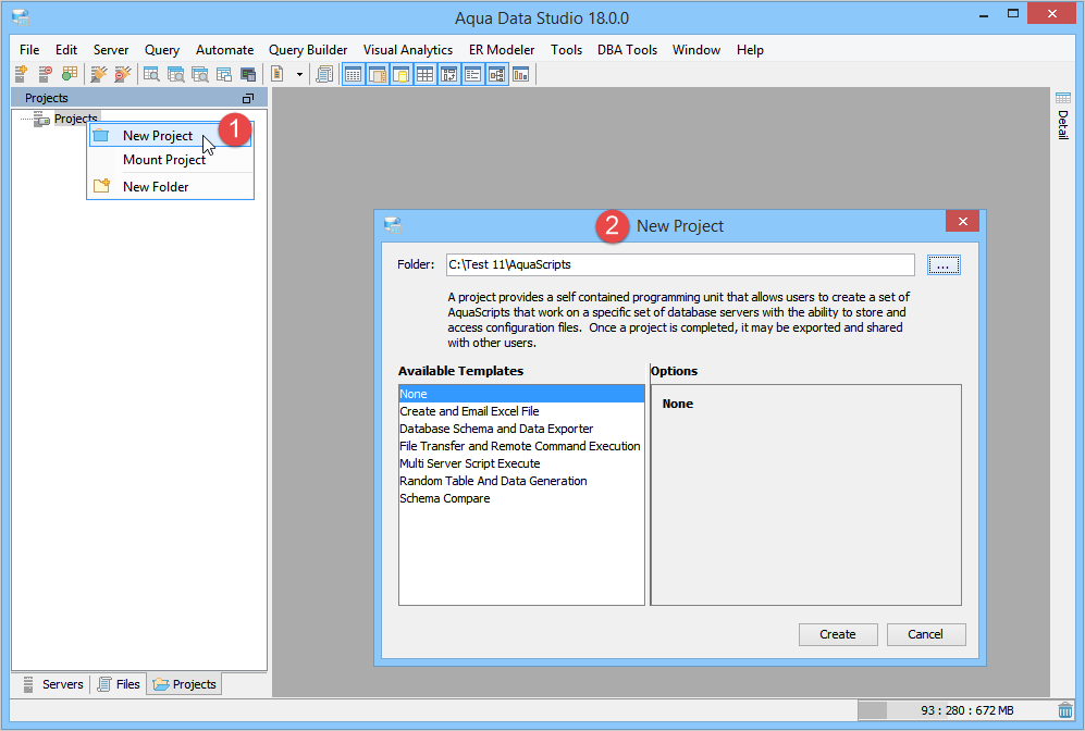 AquaScripts, Servers, and User Files: Every project has an AquaScripts directory, a Servers directory, and a User Files directory. The AquaScripts Folder holds all of the AquaScript (.xjs) files which can be executed and debugged. The Servers Folder can contain one or many registered database server connections for use by the AquaScripts in that project. If there is a server in the Schema Browser you wish to use in a Project, drag that server from your Schema Browser into the desired Project and the connection information will copy over. The User Files Folder contains files for input or output of the AquaScripts. The AquaScripts, Servers, and User Files folders can also contain multiple subfolders to assist with organizing Project content. Every Project is self-contained with its properties and can be exported as a .zip or compressed file for archiving.
