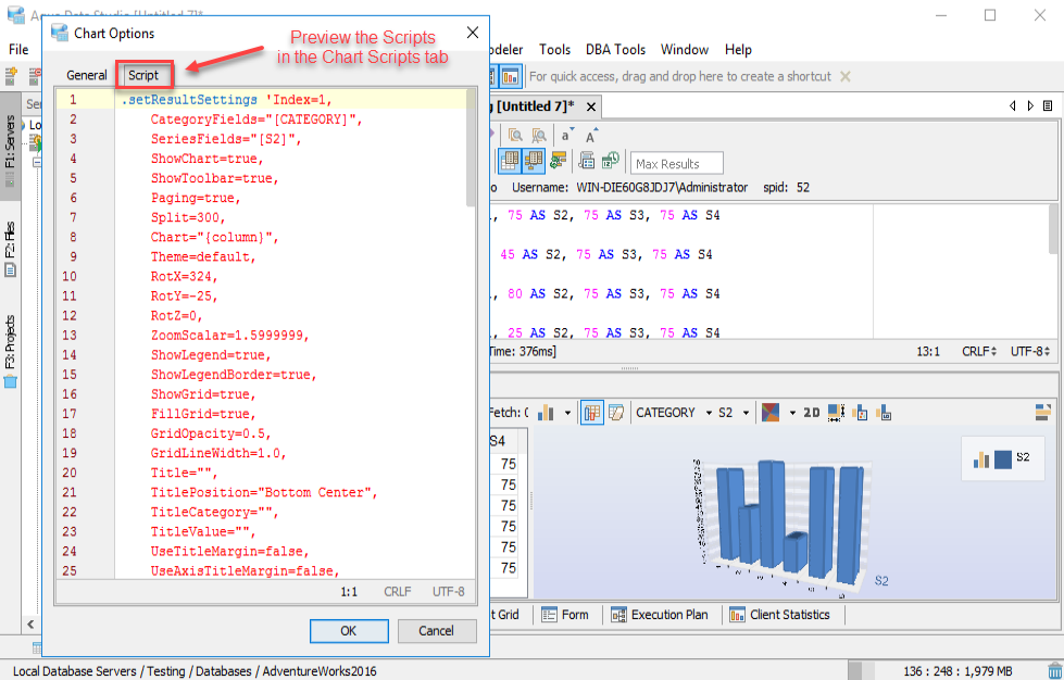 Aqua Data Studio has numerous chart types with in-depth functionality. You can enable support for charts, execute a query, generate a chart, script and share the charts with Business Analysts or Developers or any other Aqua Data Studio users.