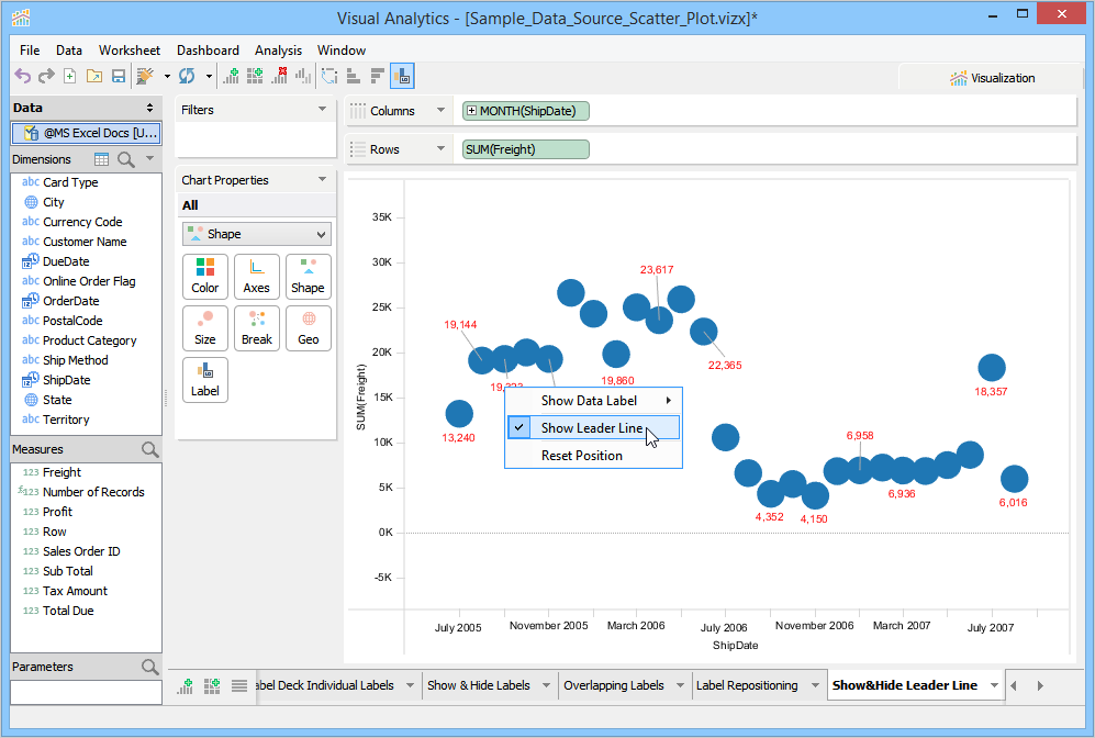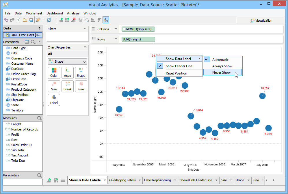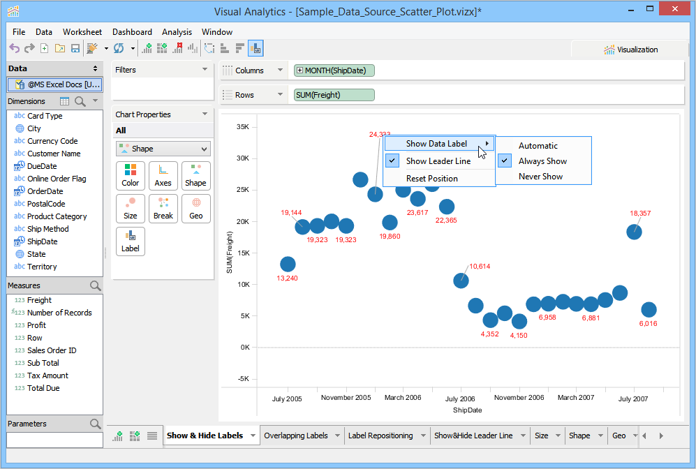 You will notice that Visualization moved Tax Amount to the Size Deck and ShipDate and Proft to the Rows Deck and Freight to the Column Deck. We have moved ShipDate to the Color Deck so that each year is displayed in a different color.