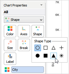 The most common Shape Chart is a Scatter Chart or Scatter Plot. Scatter Charts use Cartesian coordinates to display values for two variables for a set of data and are a useful summary of bivariate data. A variation of a Scatter Chart is a Bubble Chart where the size of the shape indicates a value.