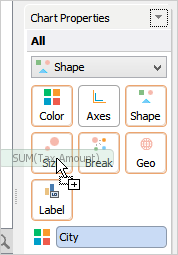 You can also add a measure field to vary the size of the shape. In the following example, we have added Total Amount from Measures into the Size Deck. This alters the circles so that their size represents the sum of Total Amount for each City.