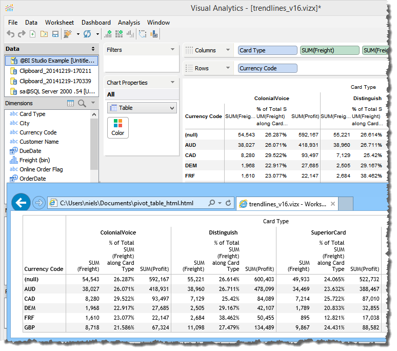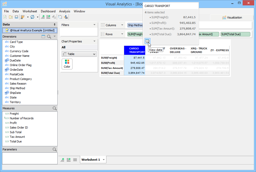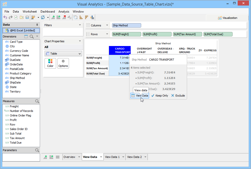 To create a Table View, drag, at least, one Measure or Dimension into a Column or Row deck and choose [Table] from the Chart Properties Type dropdown. Tables display data in text format, much like a spreadsheet, allowing you to select individual cells or groups of cells via click and drag. Columns can be sorted by clicking column header sort icons, and their widths can be stretched or shrunk by grabbing column header edges and dragging.