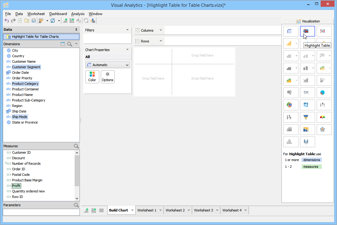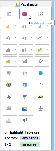 There are two ways of building a Highlight Table. We are using the Visualization Palette. Another way is to build a table first and then from the Options Deck, choose Highlight Table.