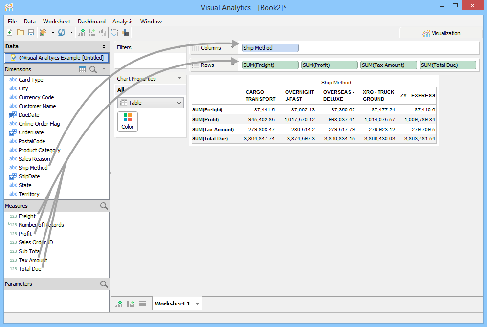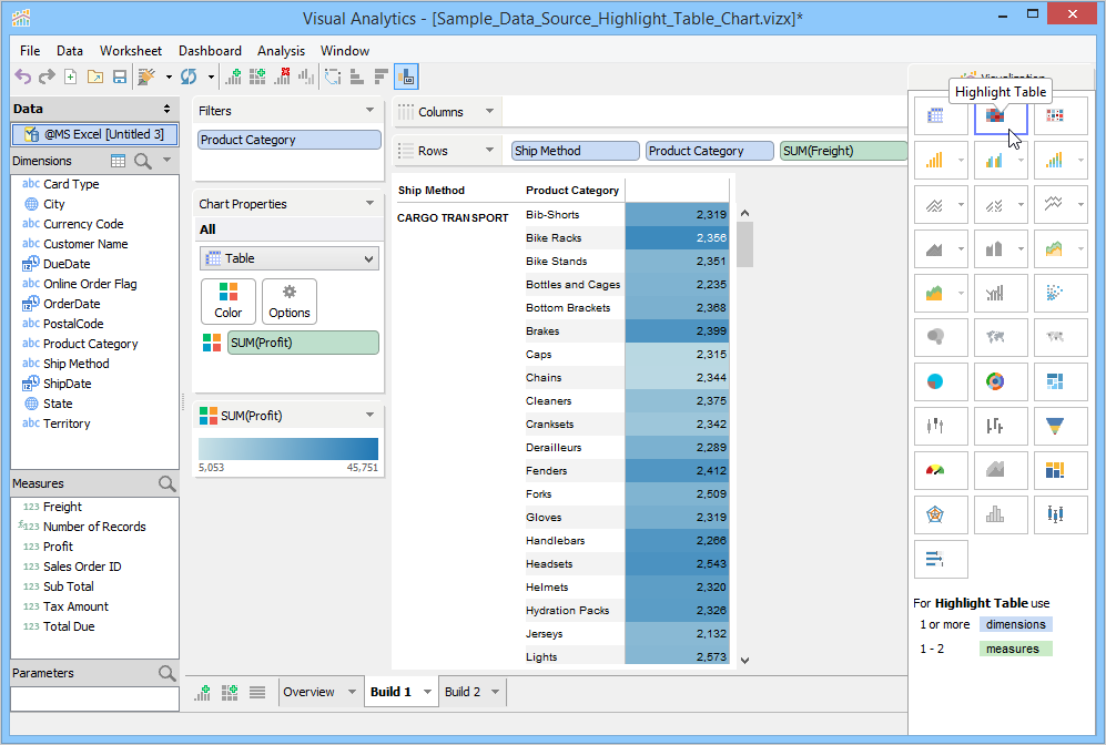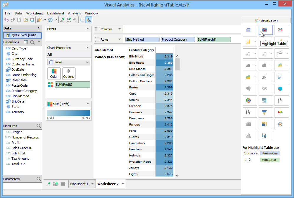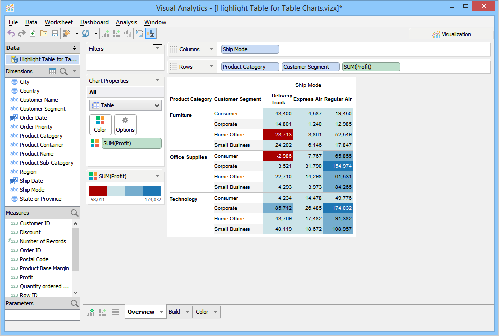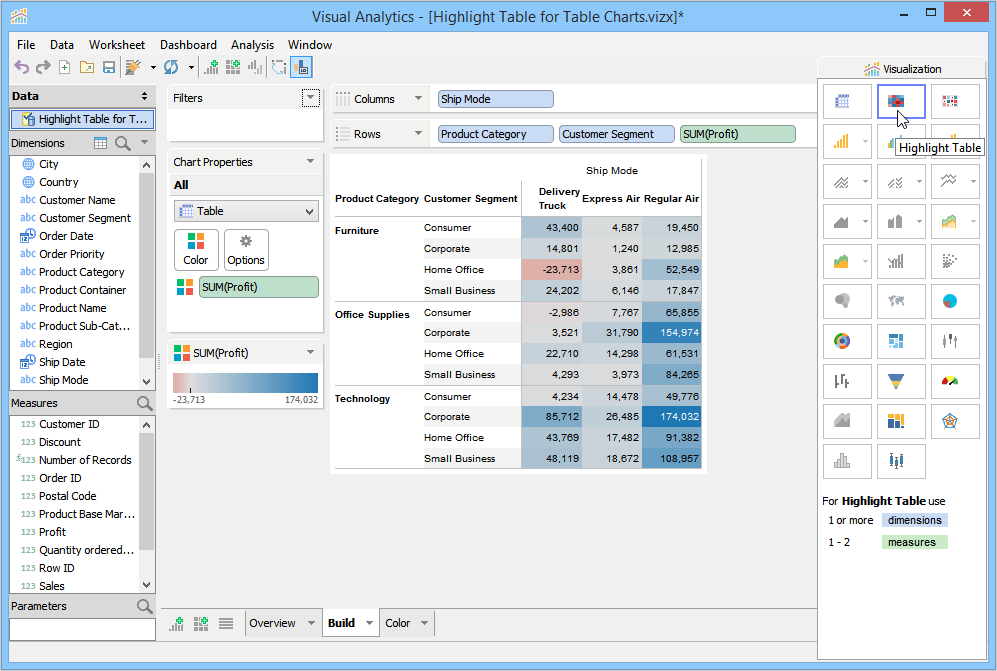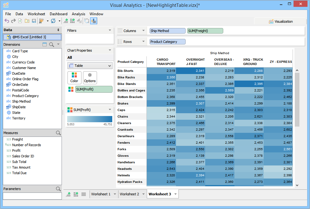 Visualization builds a Highlight Table and moves Ship Mode, Product Category, and Freight to the Rows Deck, and moves Profit to the Color Deck and applies a default color theme to the background cells of the Ship Mode rows. In the given example, we have moved Ship Method and Freight to the Columns Deck.
