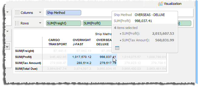 It is also possible to drag across several cells within the table and see a tooltip that summarizes all of the data you have selected. Selected cells within the body of a table have a light blue background color while the other cells dim to make your selection stand out.