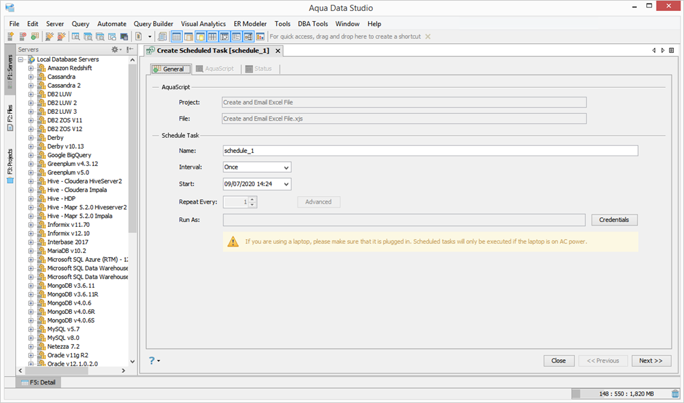 2. The first tab in the Create Scheduled Task dialog is the General tab. In this section the AquaScript project and file will be automatically filled. By default the name is a schedule_number. This can be changed to any name you want that contains only ASCII characters. Now, select the Interval for the task, select from the drop-down menu the interval you want (Once, Daily, Weekly, Monthly.) Then, choose the start date and time in the drop-down calendar menu. If the interval you choose is Daily, Weekly or Monthly, you have to choose the repetition frequency of the task. When the interval is Weekly or Monthly, the Advanced menu pops up. Once you choose the Advanced Task Settings, next is the Run as credentials option.