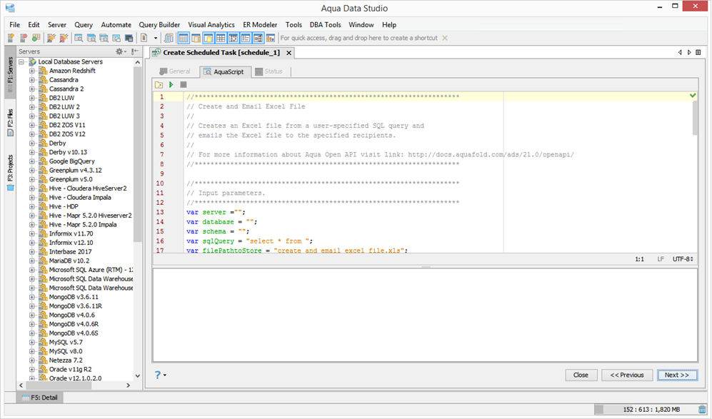 4. When you've reviewed your AquaScript project, click Next to check the Status tab where it will show the progress and detailed information of your AquaScript scheduled task executed.