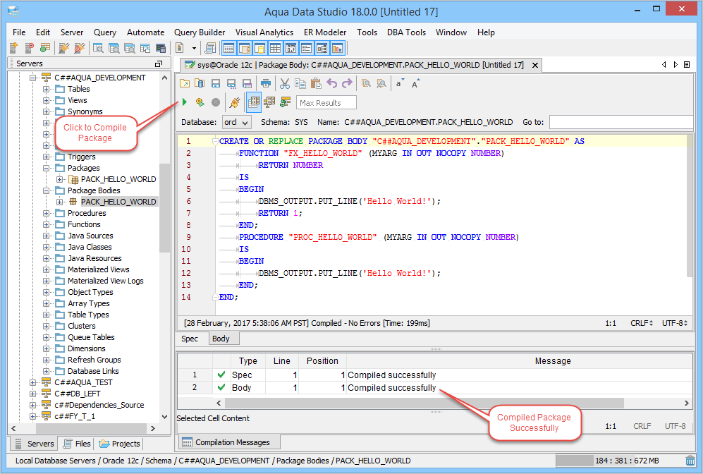 Aqua Data Studio can access and edit Procedures, Functions and Packages through the Schema Browser. Stored Procedures are subroutines stored in a database's dictionary and are often used for data validation and access control. They collect logic usually spread across several statements in complex actions for access from a single call. Functions are blocks of code to perform a series of actions used to extend the functionality of a database server. User defined functions are defined with CREATE FUNCTION in SQL statements. They can be used for converting and evaluating data or performing other actions. Packages, in Oracle, are used for encapsulating a group of functions, procedures and other program objects. Packages have specifications (definitions) and bodies. They provide containers for related items. Depending on the database version and vendor, Package, Procedure and Function debugging is also available. See the SQL Debuggers section for more. When Procedures, Functions and Packages are invalid, they are marked in the Schema Browser with a red box icon overlay. Expanding marked objects in the Schema Tree shows which specific Package contents are invalid. Options for determining if both the header and the body are both compiled when compile is executed can be set in File -> Options -> Procedure Editor.