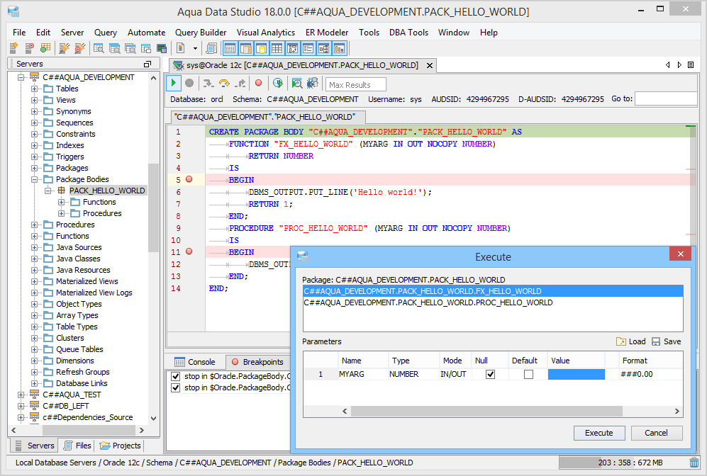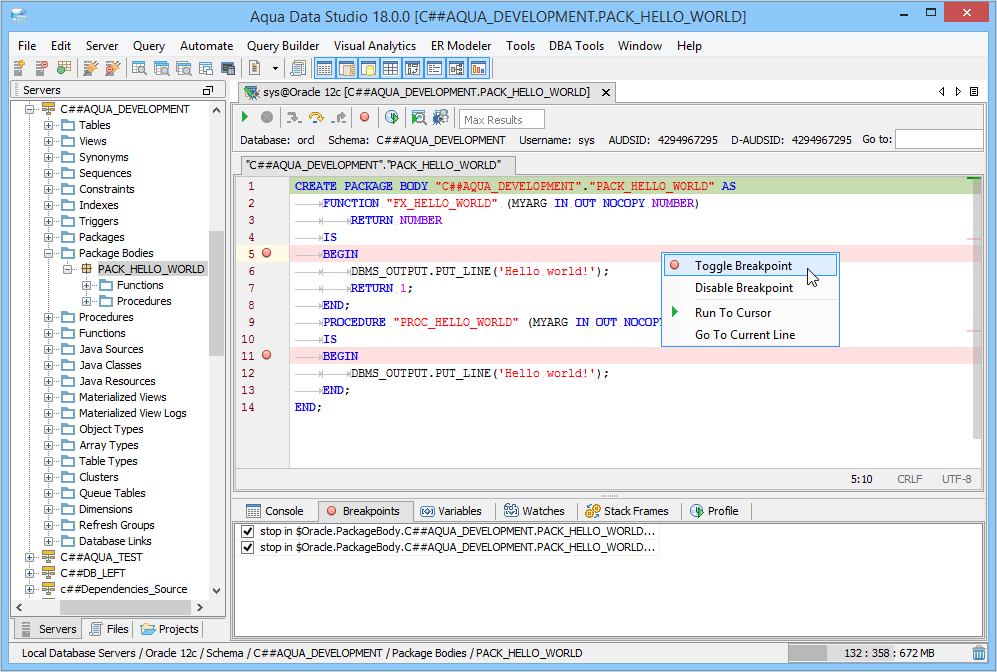 The Oracle SQL Debugger has been designed to help with testing and debugging of SQL functions and procedures for Oracle versions 9i and above. Launching the Oracle SQL Debugger The Oracle SQL Debugger is launched through a right click in the Schema Browser on Stored Procedures or User Defined Functions and selecting Debug from the popup menu. More than one debugger can be open at once, with each object to be debugged opened in a separate tab. Debugger Workspace The debugger displays a slightly modified version of the Query Analyzer Toolbar containing debugger specific menus and buttons. Along the top of the debugger are the Execute, Stop, Step Into, Step Over, Step Return, Toggle Breakpoint, Turn On Profiling, Target Query Window, Debugger Query Window buttons. Next to the buttons is the Display Max Results input field. Beneath the buttons is the connection information, username and SID information. The procedure or package displays in the debugging window, within which breakpoints can be added by right clicking and selecting "Toggle Breakpoint" from the popup menu. When this window has focus, and a line has been clicked, it is also possible to select "Run to Cursor," to run the debugger up to that line in the procedure. From the same popup menu, "Go to Current Line" brings the cursor to the current line, which is very useful when debugging multiple lengthy procedures. Below the debugger window are tabs for Console, Breakpoints, Variables, Watches, Stack Frames and Profile. The Console tab displays any errors or messages generated as debugging progresses. The Breakpoints tab indicates the lines of the procedure where breakpoints are set and allows them to stop execution or not. The Variables tab lists any variables by name, their value and type. The Watches tab allows selecting specific variables to be observed as they change, reducing from a possible list of hundreds to a select group. The Stack Frames tab lists the local variables of the functions, and the arguments to them. The Profile tab lists commonly used terms or values a user works with on a regular basis in the debugging process. Once execution of a procedure has begun through the use of the Start button at the top of the debugger window, the bottom left of the window is occupied by the Text, Text History, Grid, and Pivot Grid Results tabs. This area functions just as the Query Analyzer window does, revealing the results of procedures at each breakpoint or execution cursor. The Oracle SQL Debugger features include: