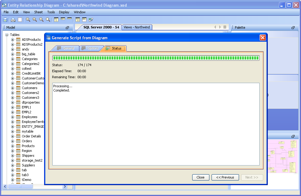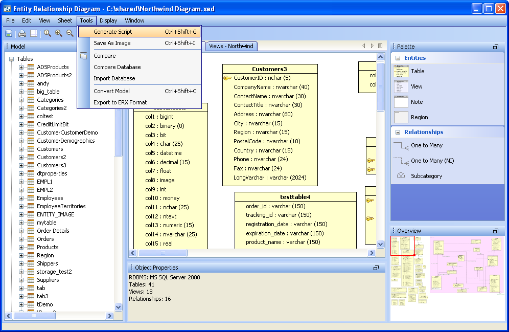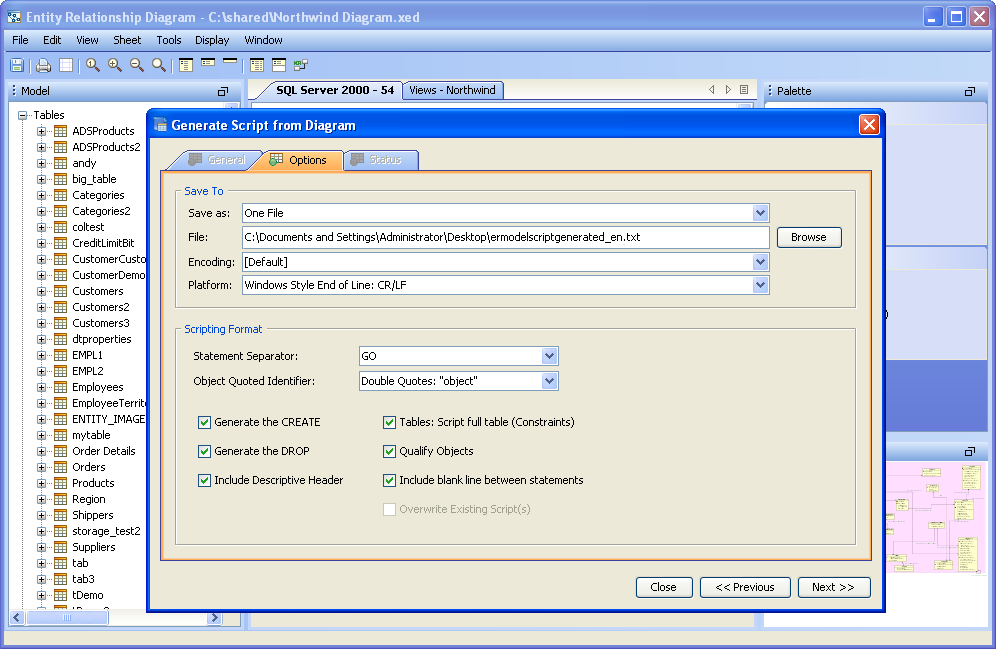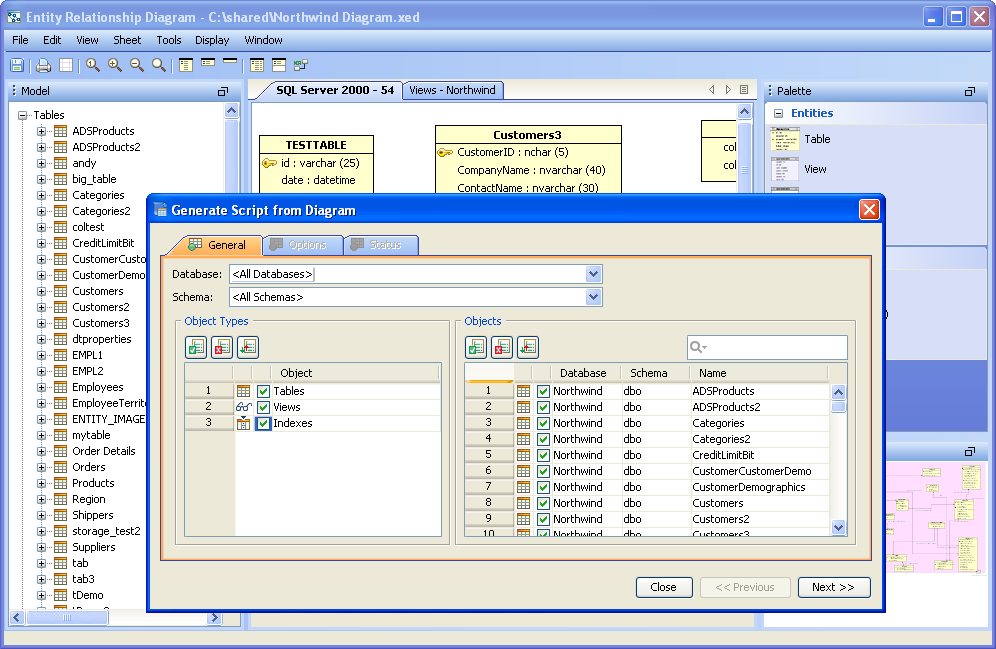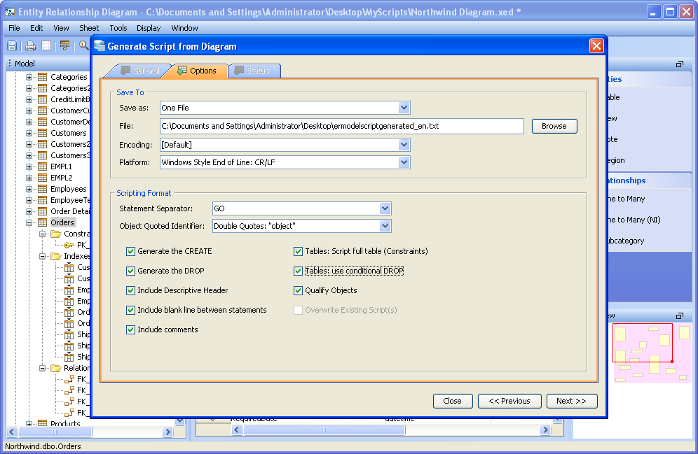 Scripts can be generated from the content of the ER Modeler (Forward Engineering), allowing conversion of the diagram into database commands and DDL. The resulting DDL can be imported via Aqua Data Studio's import command into another database, or saved and shared as an SQL script. Generating Scripts from an ER Model works nearly the same as generating a script through right click on an object in the Schema Browser, and selecting "Schema Script Generator." Generating a Script from an ER Model 1. Select "Generate Script" from the Tools Menu in the Menu Bar, or use the keyboard shortcut CTRL + SHIFT + G. 2. Select what database, schema, and schema objects are to be generated from the diagram. Use the quickfilter to focus a search to key words or wildcards. Individual Object Types ( Tables, Views and Indexes) and individual Objects can be selected. Click next. 3. Modify the Options for the script. Save as a single file, one file per object, or choose to preview the script without generating any files. Choose the script location, encoding, platform, statement separator, object quoted identifier, CREATE generation, DROP generation, Include Descriptive Header, Include Blank Line Between Statements, Include Comments, Qualify Objects, and other options. Click next. 4. View its status for errors and elapsed time as the script is being generated. If the script generated successfully without errors, click close and browse through the operating system to the destination directory selected above to find the file. If "Preview" was selected in the "Save As" option, the Preview tab will open containing the resulting script with syntax highlighting as set under File->Options->Editors->SQL Editor The generated script contains all of the database commands needed to generate the diagram within a database.