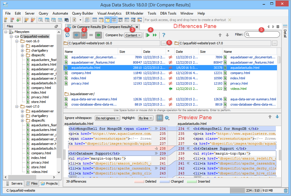 . The contents of the selected file are shown in the lower pane, also known as the Differences pane with the differences highlighted. This pane is further split into a split-pane where each file takes up half of the pane and shows connecting splines for identifying where the deletions, changes and additions occur. Comparisons show the character differences in a modified line with bolding and background color highlights indicate modified blocks. If they are not identical they are highlighted by default in pink (deleted), purple (changed) or green (added). These colors can be changed from the Options dialog. You can also use this tool to synchronize the contents of the directories