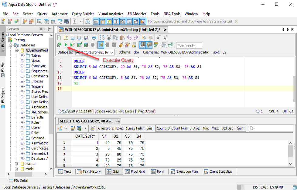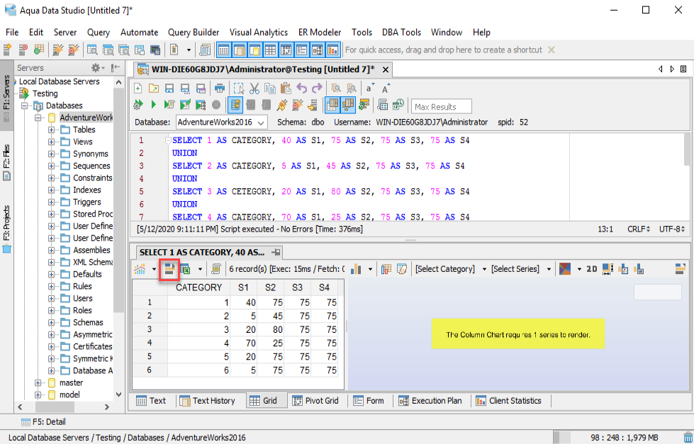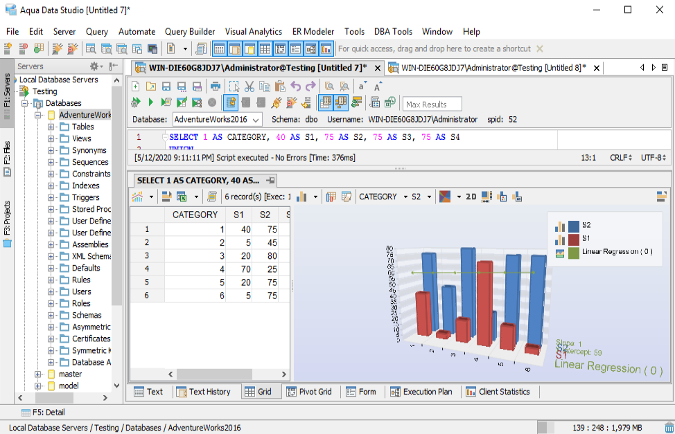 Aqua Data Studio has numerous chart types with in-depth functionality. You can enable support for charts, execute a query, generate a chart, script and share the charts with Business Analysts or Developers or any other Aqua Data Studio users.