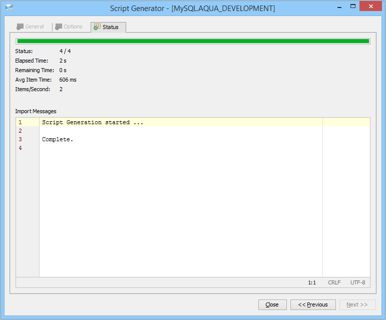 4. Click Next to generate the scripts for the selected objects. The Status tab displays any warnings or messages as the export progresses. The output process can be halted at any point by clicking Cancel. 5. If Preview was selected as the destination of the export, the Preview Tab displays the export with syntax highlighting for copy and paste use. Click Close to close the dialog or click Previous to change selections and regenerate the script(s).