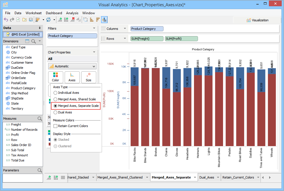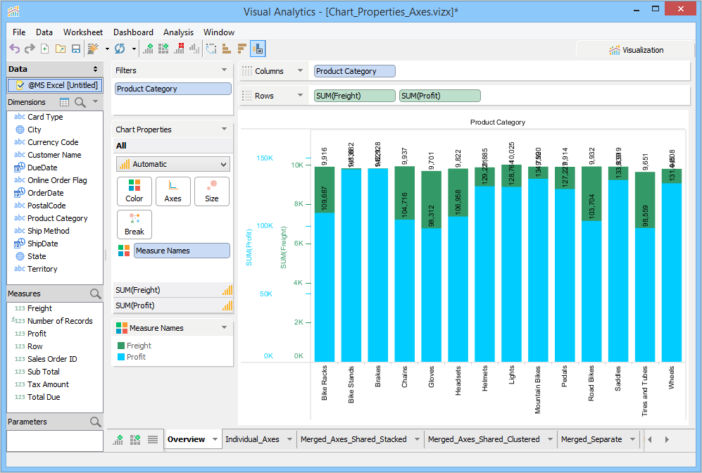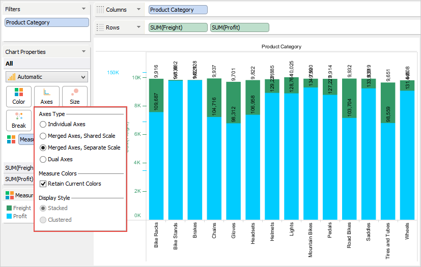 The Chart Properties deck allows you to modify and control the chart shown in the chart view. The contents of the Chart Properties deck changes depending on how many dimensions and measures appear in the Columns and Rows decks. If there are at least two measures present in a Columns or Rows deck, you can select options in the Chart Properties > Axes.