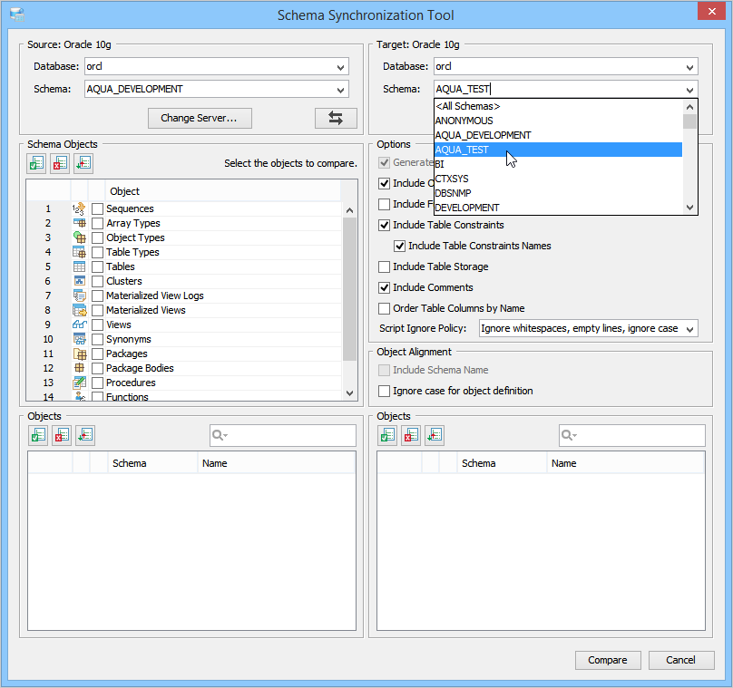 You can select all objects or specific objects for schema compare and synchronization. Different databases have different schema objects.