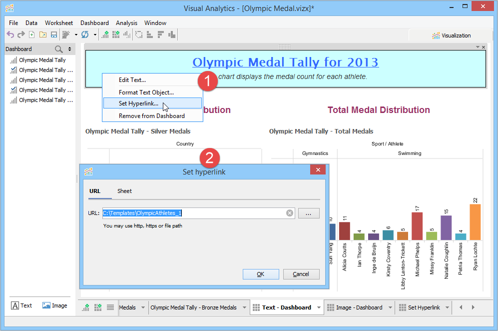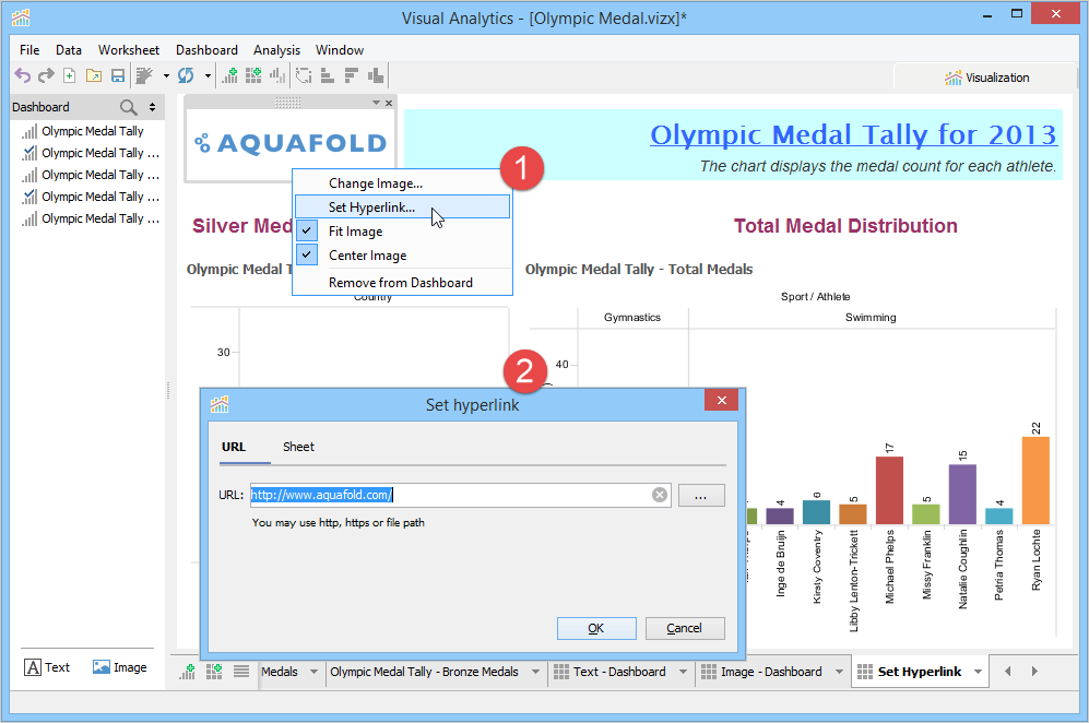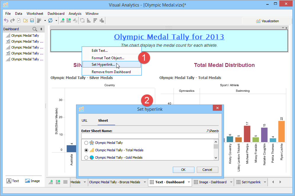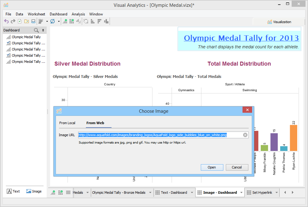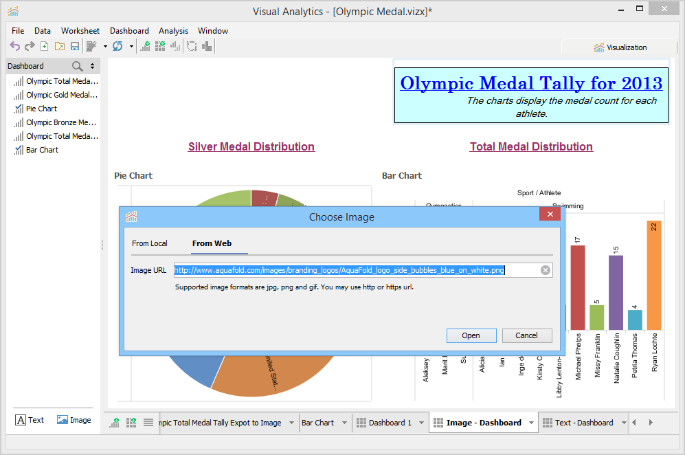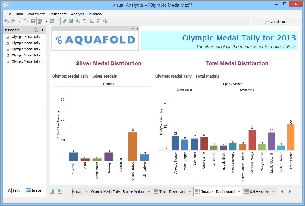 A Dashboard is a special sheet that can contain any combination of worksheets from your workbook, along with text and image objects. Dashboards are used primarily to display the view area from worksheets, where worksheets are used for editing and creating views. Using the text object, you can add notes, pointers or detailed descriptions for a worksheet. By using the image object, you can insert images from your computer or any web page.