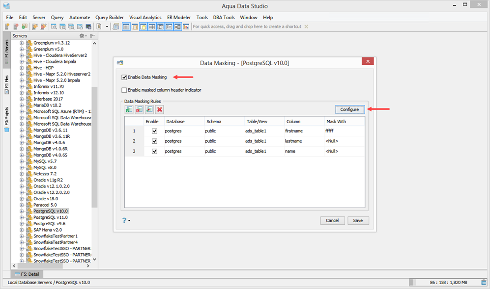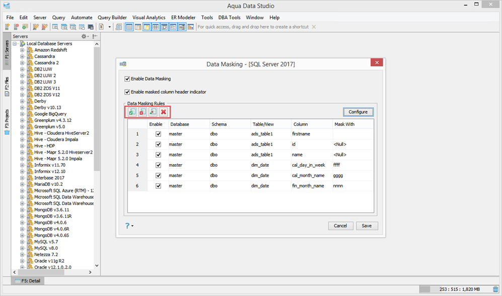 Aqua Data Studio Data Masking lets you mask database table columns which contain sensitive information and protect Aqua Data Studio output from users who do not need to see the information. This is done by either substituting a new value of the same data type or nulling out the column in the result set. Aqua Data Studio users can select specific table columns to mask out before sharing information with colleagues.