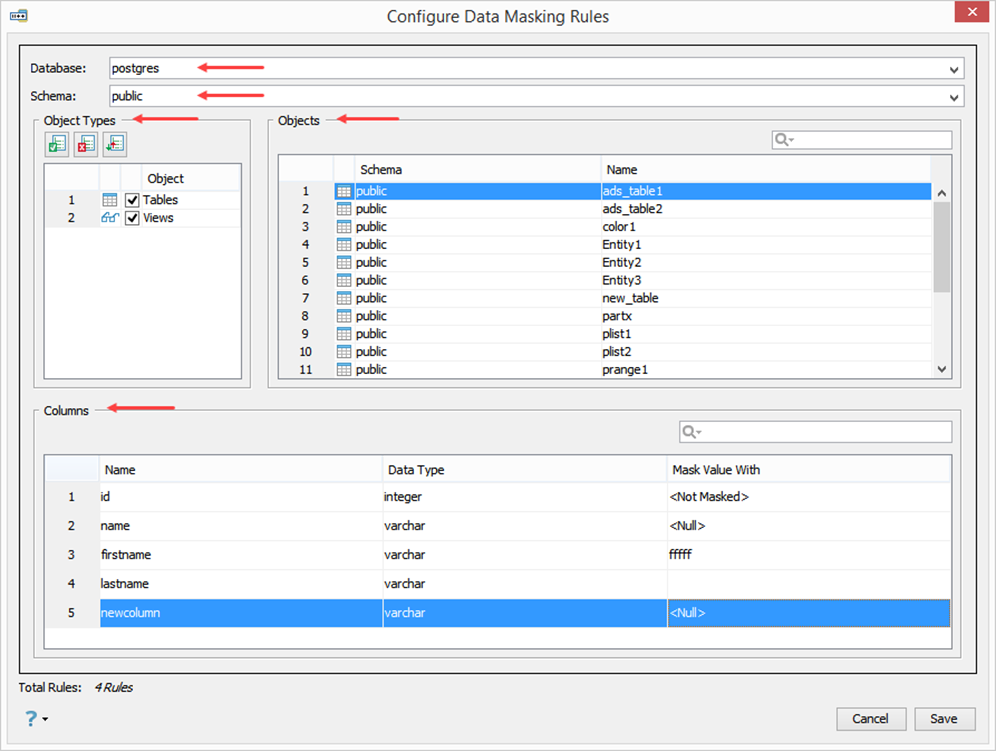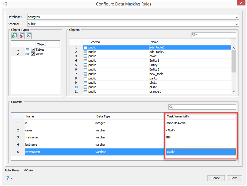 In the Configure Data Masking Rules window, select which Database, Schema, Object Types, and Objects you want to mask out. First, select the database and schema location for the table(s) that you want to mask from the dropdowns. In the Objects Types window, select table and/or views. This will display all the tables and views for that database/schema combination in the Objects window. Selecting an object from the Objects window will display the columns for that object in the Columns section. Select which columns you want to mask and enter the Mask Value.