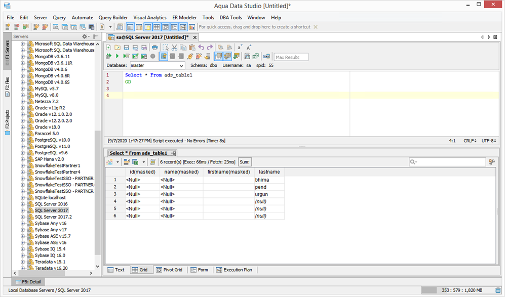The Aqua Data Studio Data Masking tool makes it convenient to select only the information that you want to be visible to others in your result set while still giving them access to a table's complete result set. This is done so that the data remains structurally workable but does not expose sensitive information.