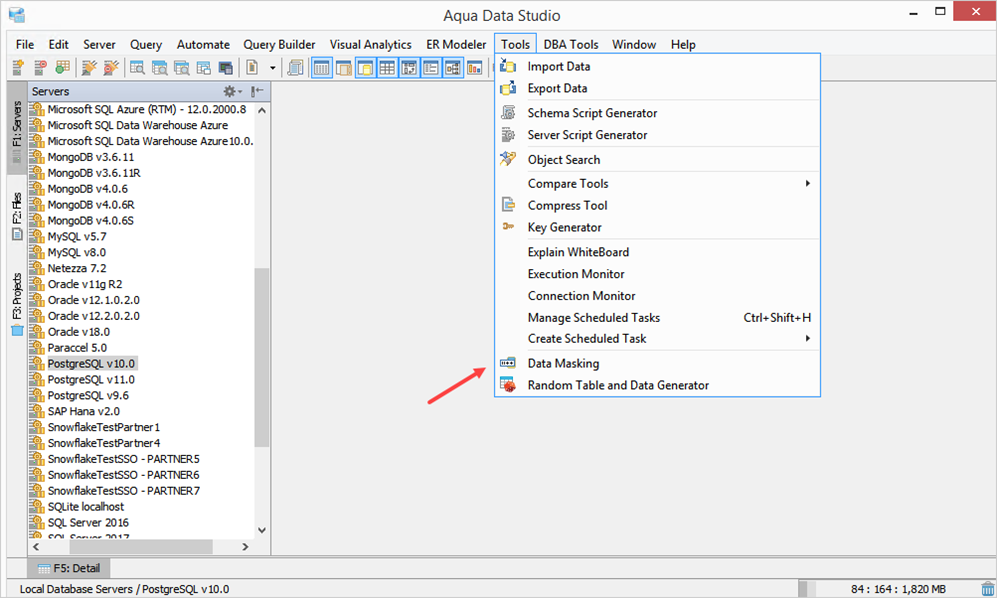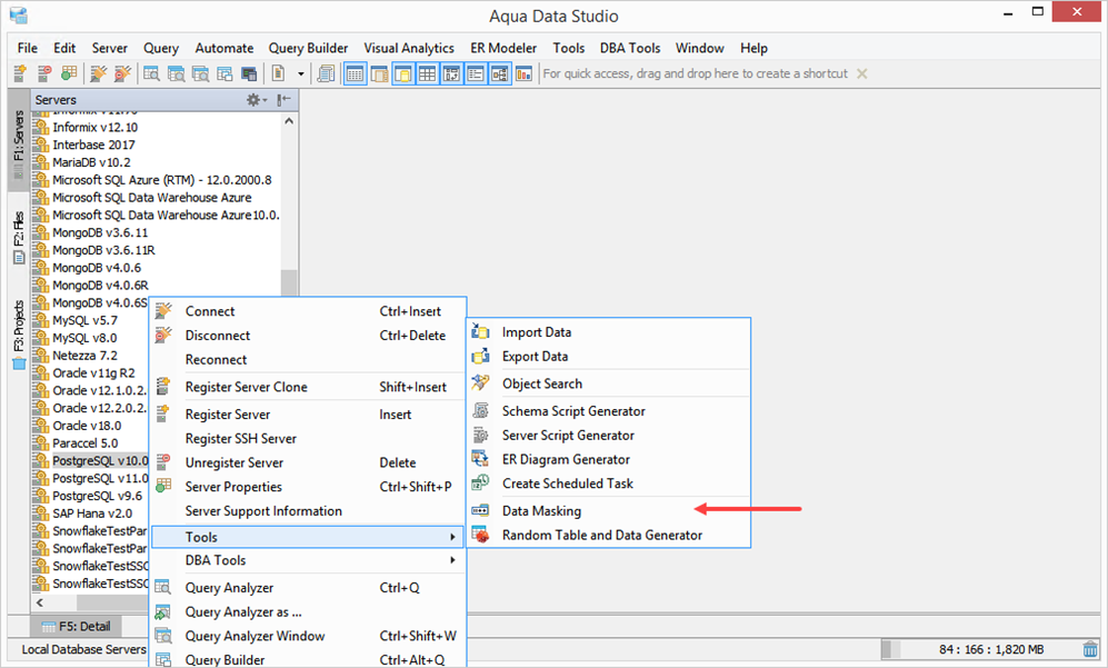 Data Masking can appear in different tools. Query Analyzer, Query Builder, Fluidshell, Aqua Command, Data Export, Aqua Script, and Edit Table Data.