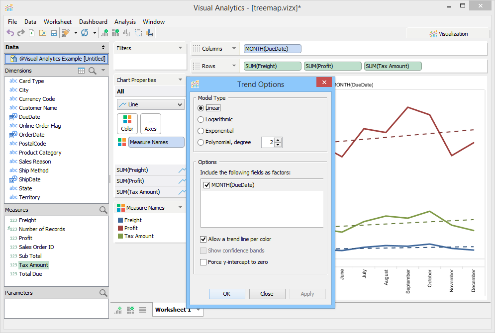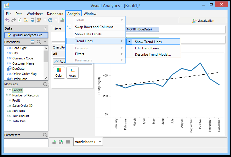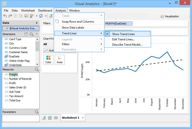 Trend Lines are lines that connect two or more points and then extend into the future to assist in detecting and predicting trends in time-series data. To display Trend Lines select [Analysis > Show Trend Lines]. Trend Lines display as black lines overlaid on the current view and are dashed when shown over Line Charts and solid when shown over bar charts to prevent confusing them with original chart content. You can also edit Trend Line Options with [Analysis > Trend Lines > Edit Trend Lines...] when [Analysis > Trend Lines > Show Trend Lines] is enabled.