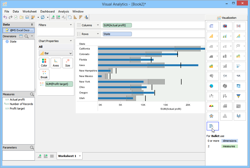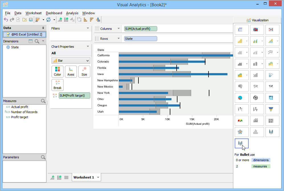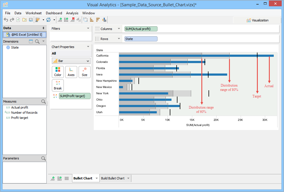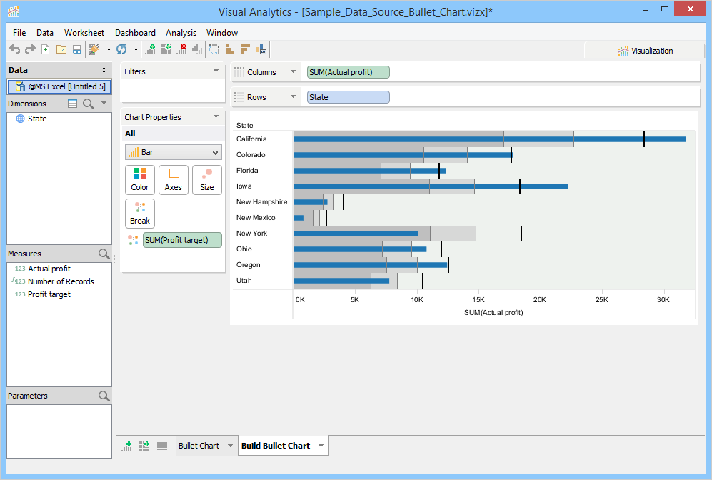 Visualization builds a Bullet Chart within the context of distribution ranges and reference lines. State forms the Y-axis, and Actual profit forms the X-axis. Visualization moves Profit target to the Break Deck. By default, Visualization plots a reference line. It places a line at the average value along the axis and shades between 60% and 80% goal completion. The reference line helps you to see how each state performed against the average.