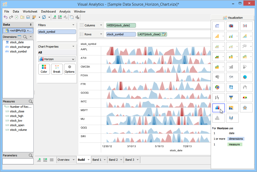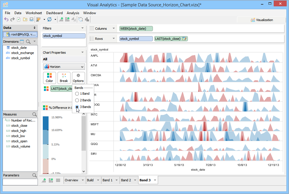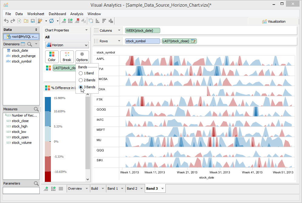 The number of bands controls the number of times the chart is divided and layered on top of each other. This has the desired effect of reducing the amount of vertical space required to draw the chart. For every layer or band that is added, a different color intensity is used to distinguish each band. You can easily spot stocks with extreme values as they appear in darker shades.