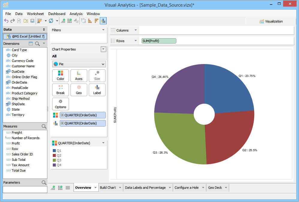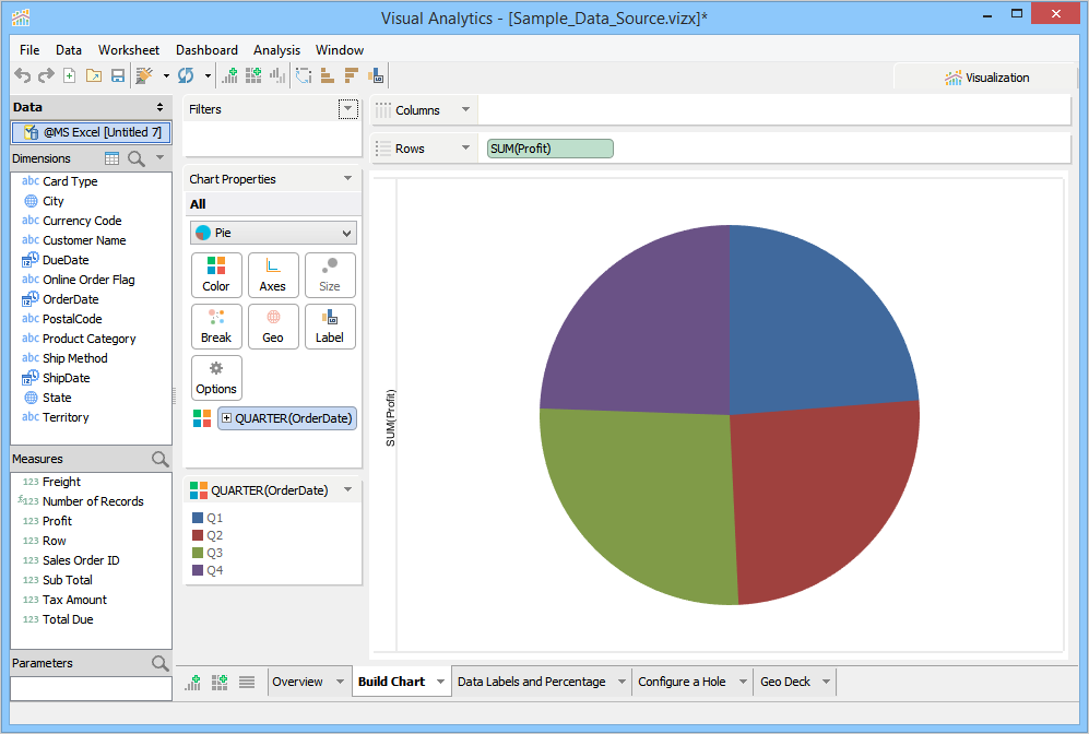 In the sample data source, we have changed the YEAR(OrderDate) to QUARTER(OrderDate). You will notice that Visualization has moved the QUARTER(OrderDate) Dimension to the Color Deck but retained the SUM(Profit) Measure in the Rows Deck. You will also notice that Size Deck is disabled. You can use this deck when you plot a symbol map via Geo Deck.