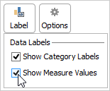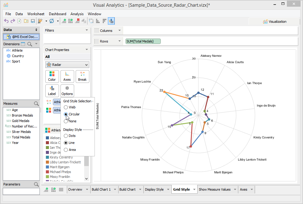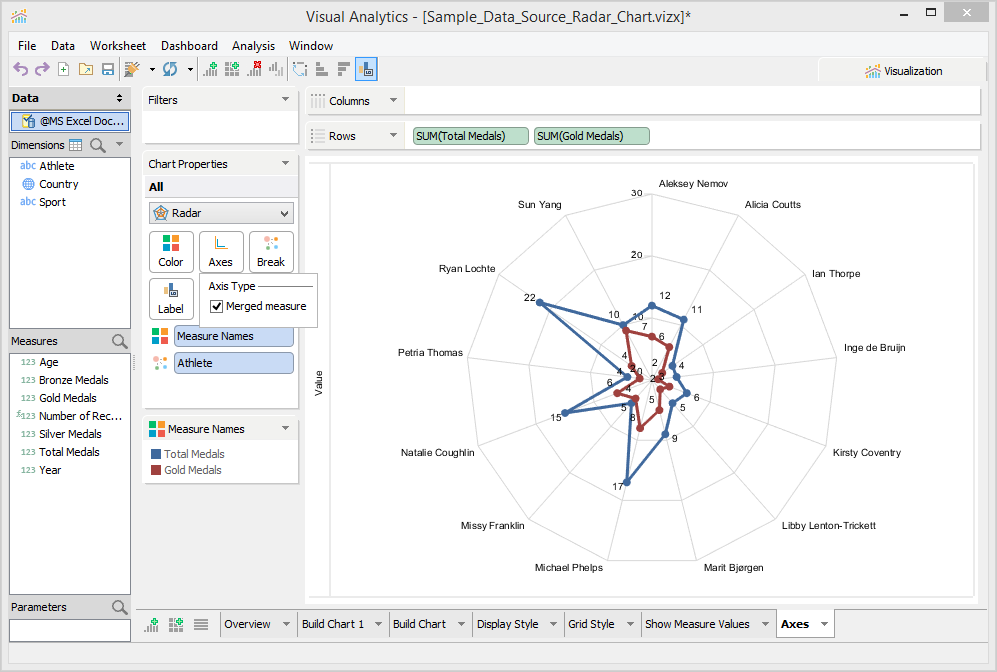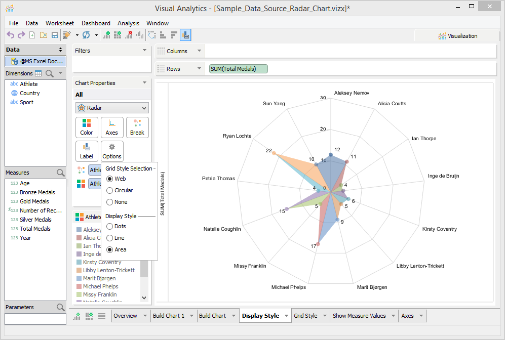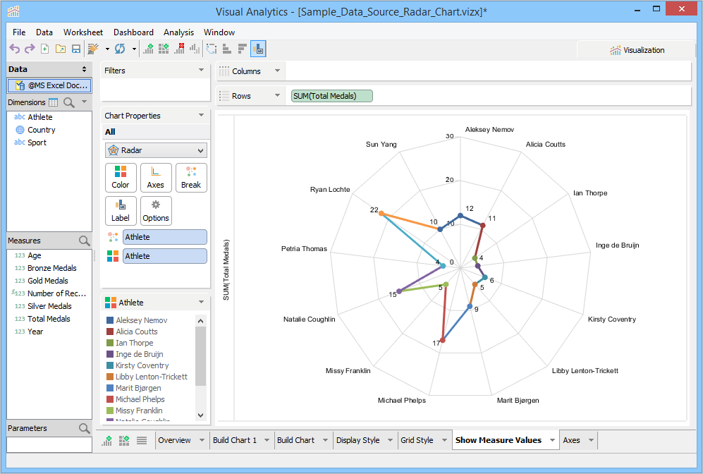 Visualization moves Athlete from the Columns Deck to the Break Deck. Visualization is displaying the athlete names on the chart. If you click the Label Deck, Show Category Labels are selected by default. As the data appears in a spider pattern, it is easy to interpret that Ryan Lochte dominates the medal tally.