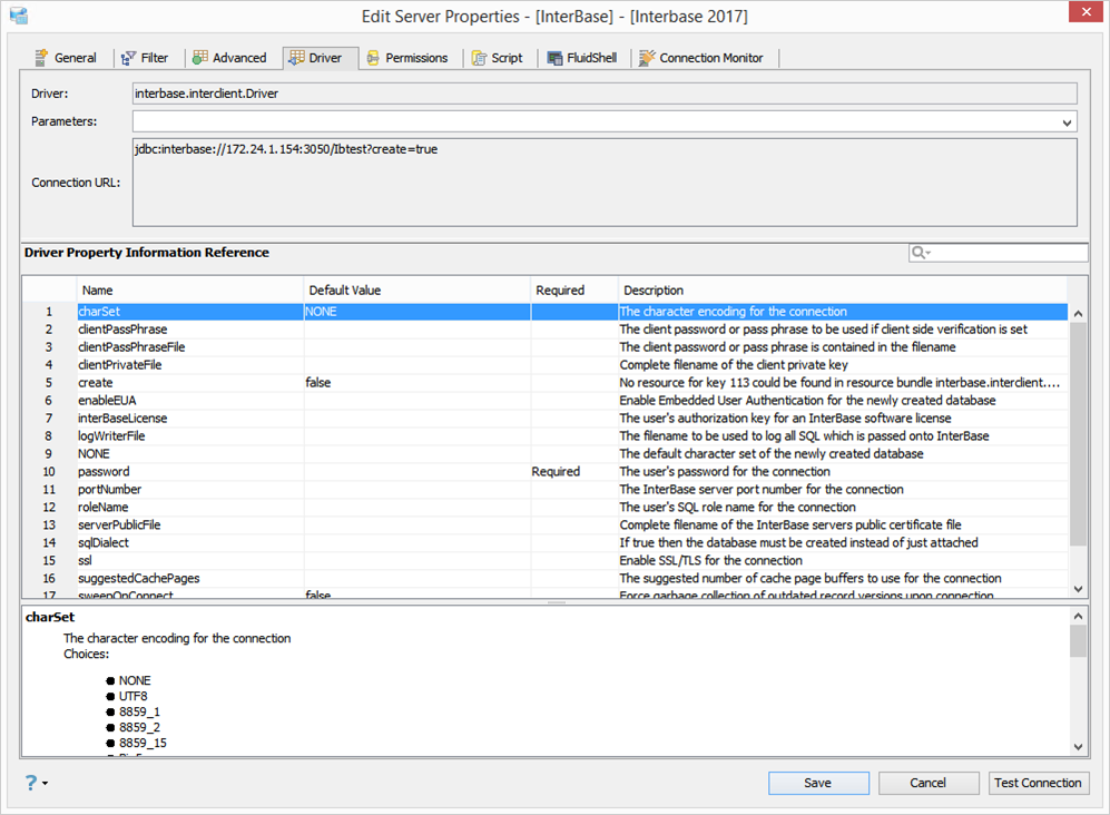 With options in Driver properties of a Server, you can edit/view the: