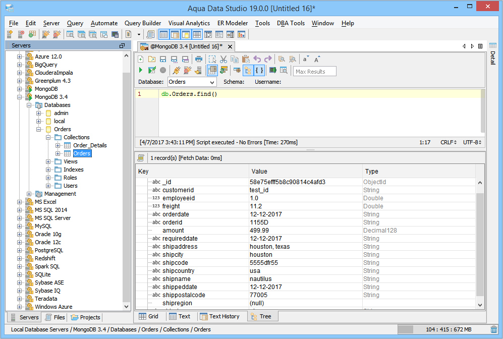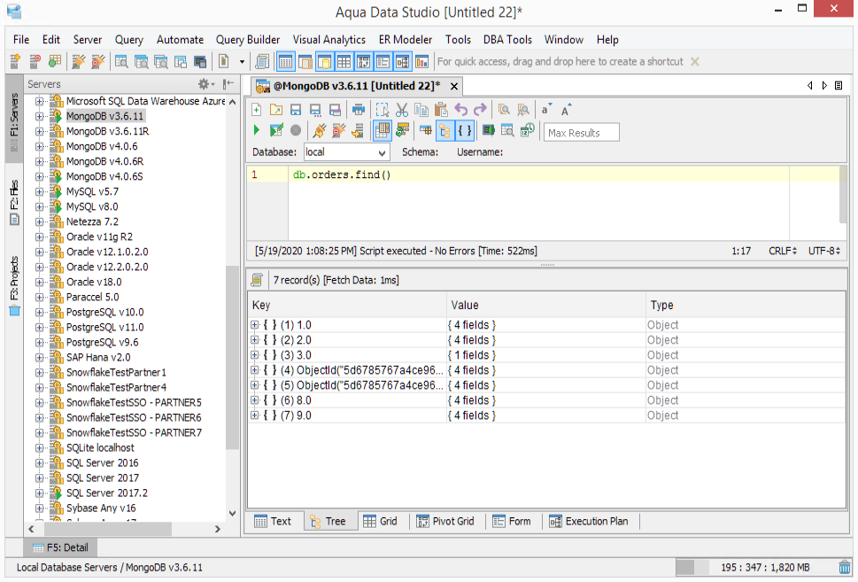 The MongoJS Query Analyzer is another powerful tool in Aqua Data Studio which can execute JavaScript commands against one of the most widely adopted NoSQL database management systems. The JavaScript statements and queries normally run within a MongoDB shell command line interface and can be typed and executed within the MongoJS Query Analyzer (CTRL+E). The MongoJS Query Analyzer shows the results in a tree hierarchy, grid, and as text results. We've combined all of our easy-to-use and features in Query Analyzer functionality to MongoJS Query Analyzer. This includes statement auto-completion and syntax highlighting. The MongoJS Pretty Print JSON is another new feature which allows you to display the JSON result in an easy to read format.