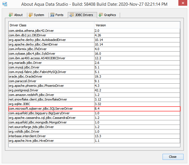 To update the Aqua Data Studio JDBC drivers for Microsoft SQL Server you need to overwrite the Aqua Data Studio sqljdbc42.jar file. Below is a listing of the Aqua Data Studio library directory [ADS_INSTALL]\lib\drivers\ ...