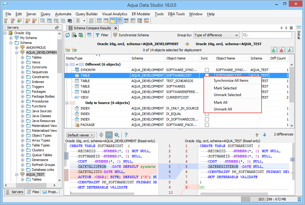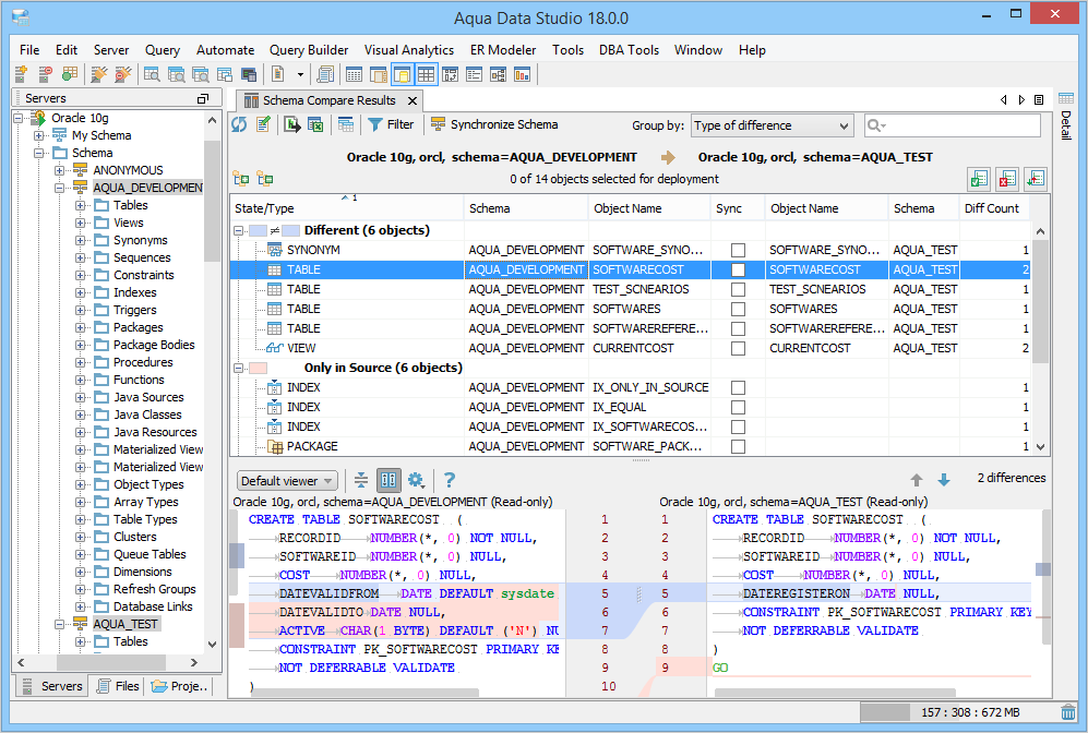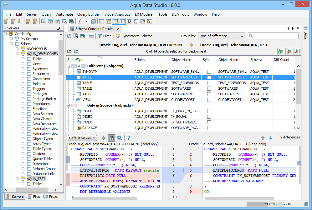 On selecting an object, you can view the source and target differences in different color codes in the SQL Differences pane. The script differences are shown in the default viewer where the source and target scripts are positioned side-by-side.