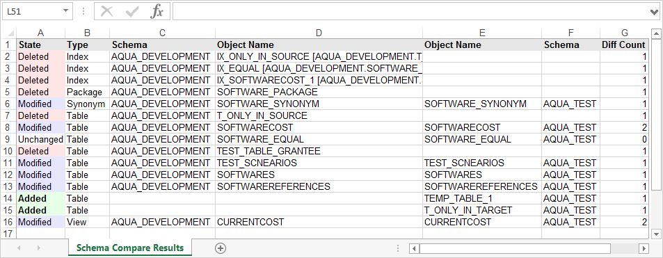 State is the color coded result and Type is the object type that corresponds to the object in the Object Name column. Depending on the option you choose from the Group by drop-down, Schema Compare displays state and type in the same or separate columns. For more information, see Group by. |