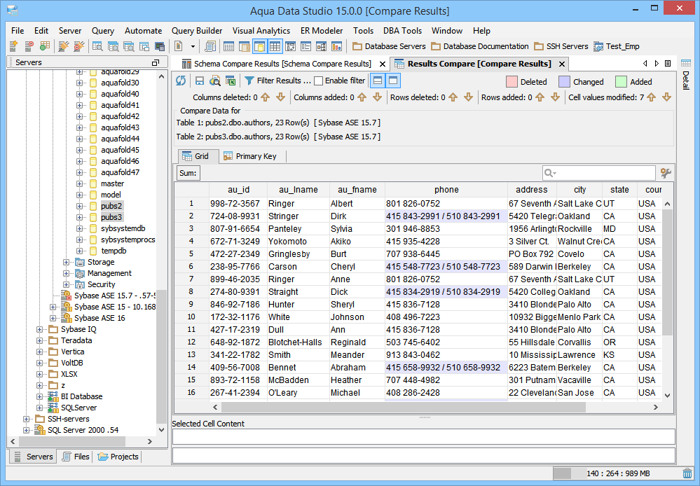 If you want to change the default color codes, then on the Aqua Data Studio menu bar, click File > Options > Compare, and then choose the color code to change (Additions, Deletions, Changes).