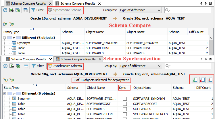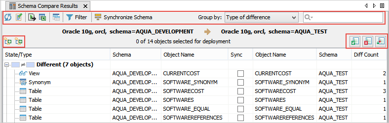 Allows multiple object selection ( You will not see these icons if you have launched the Schema Compare Results tab from the Schema Compare Tool. |