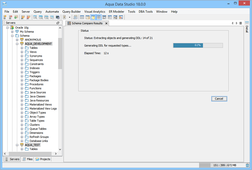 If you click Cancel this operation, the Schema Compare Results dialog is displayed. You can choose to cancel the current compare operation, abort and start a new compare, or continue with the existing compare operation.