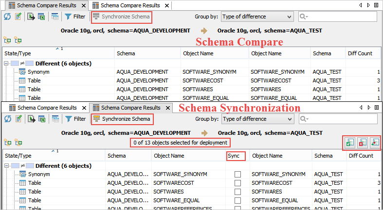 The Schema Synchronization Tool does not group the schema objects. Instead, it lists the objects according to their object name. On applying a sort to the object names, the Schema Synchronization Tool sorts the schema objects alphabetically in ascending or descending order. Unlike the Type of Differences view, the Schema Synchronization Tool displays object state and object types in separate columns.