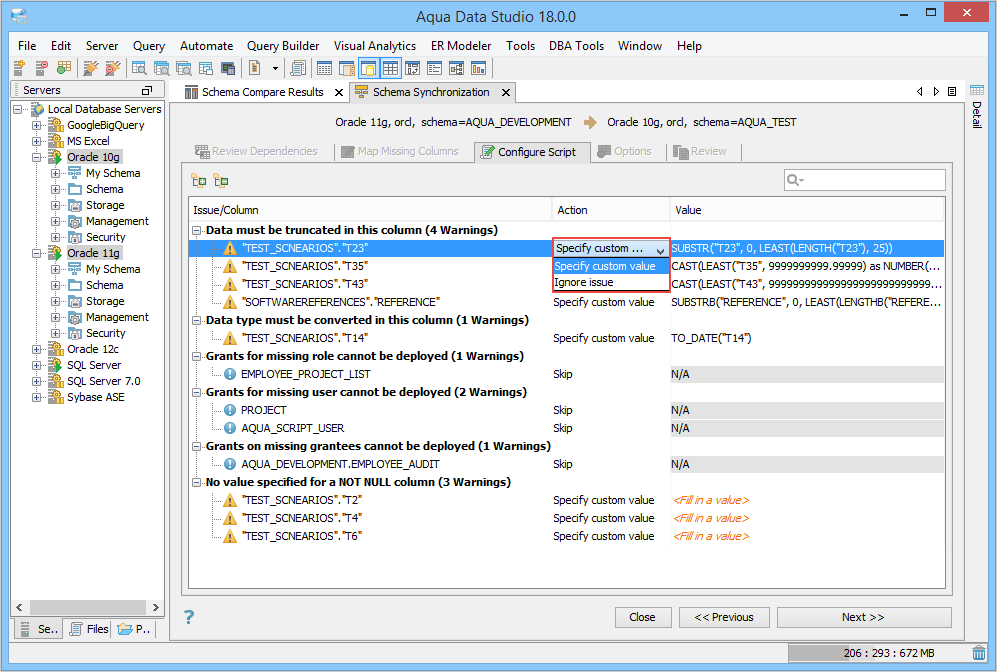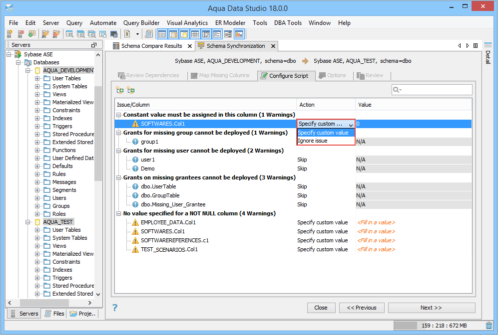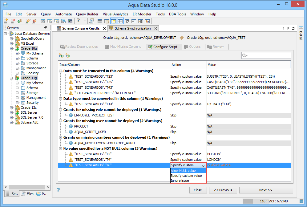 You see actions and modifications that Schema Synchronization will perform on the objects of the target schema. You can view these actions in different groups by selecting an option from the View by drop-down list.