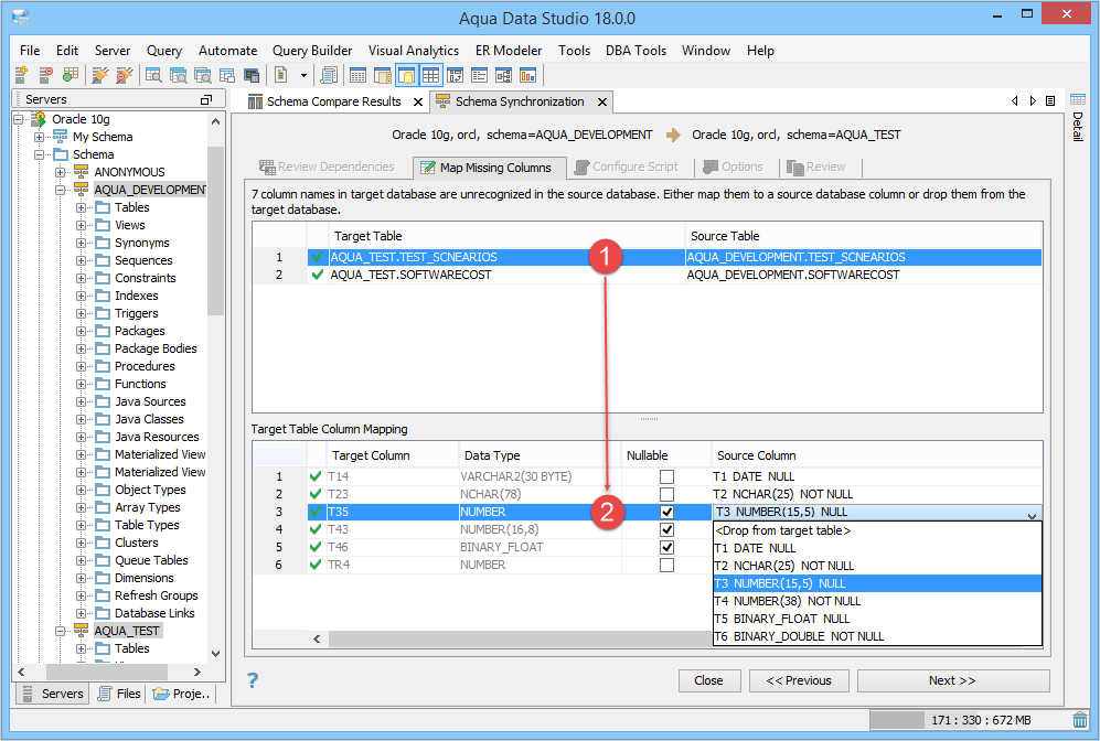 After reviewing the schema compare results, select objects for synchronization, then click , and complete the synchronization process in the following order.