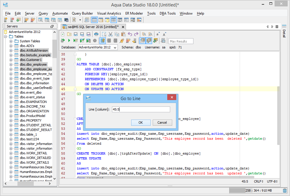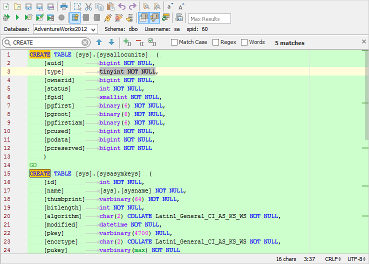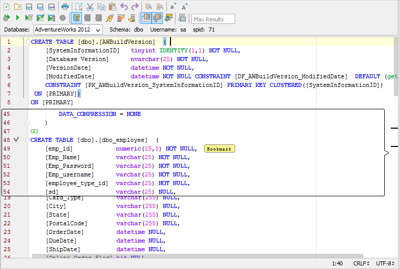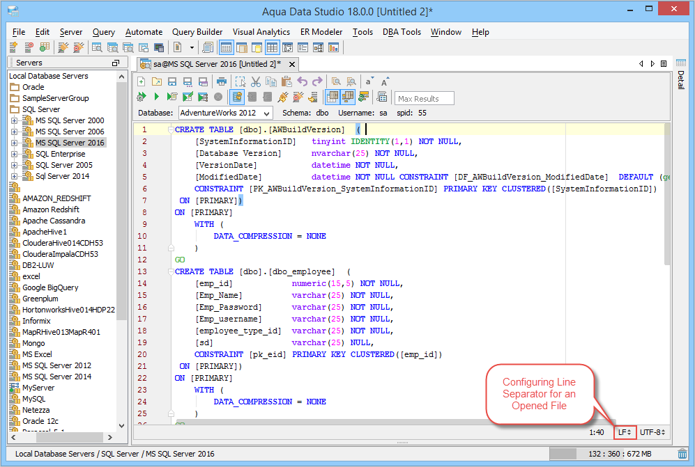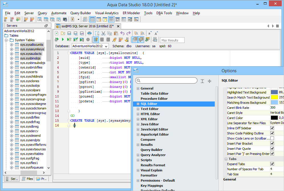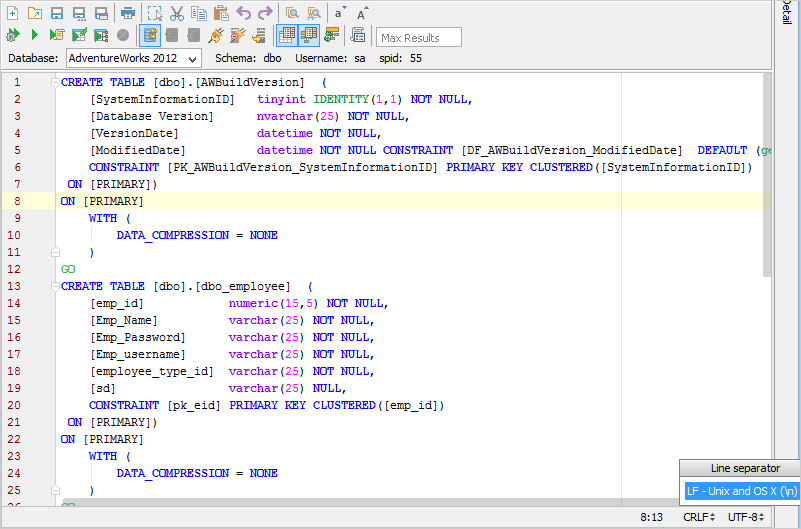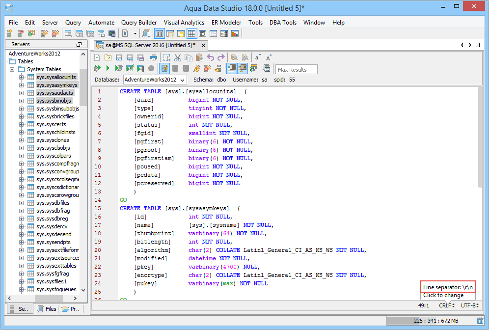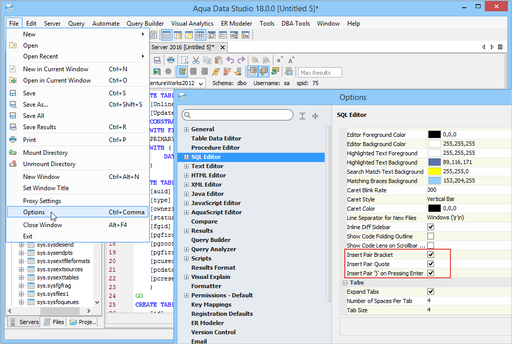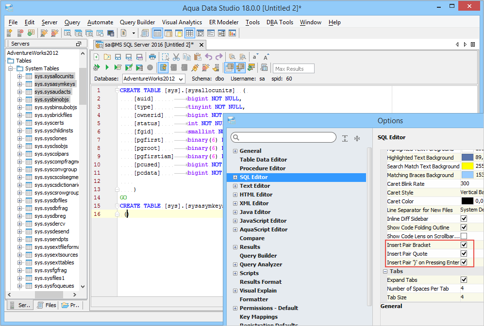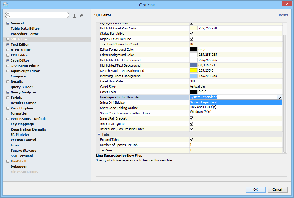 By default, Aqua Data Studio applies indentation of the current line to the next line when you press Enter. On unselecting this setting, no indentation is performed and the cursor is positioned in column 1 of the next line.