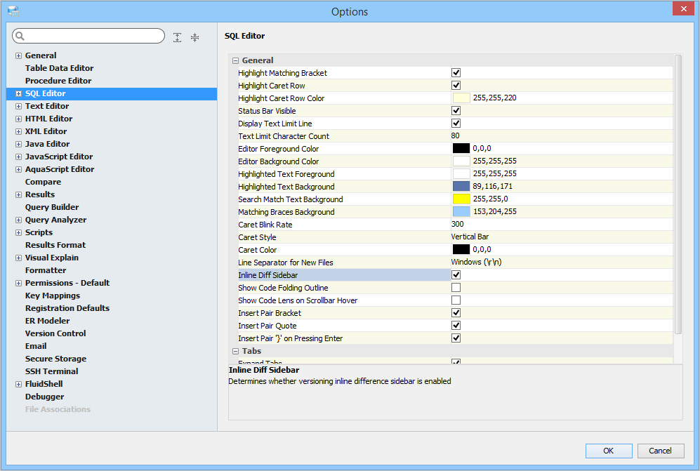 | Insert Pair Bracket | Automatically inserts a corresponding closing bracket when you insert an opening bracket. |