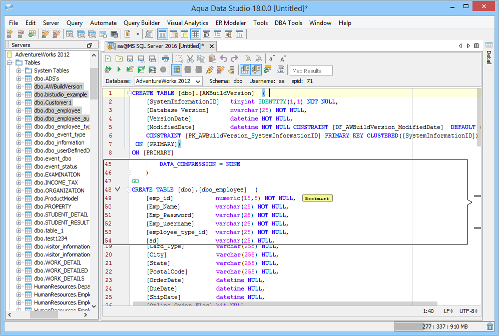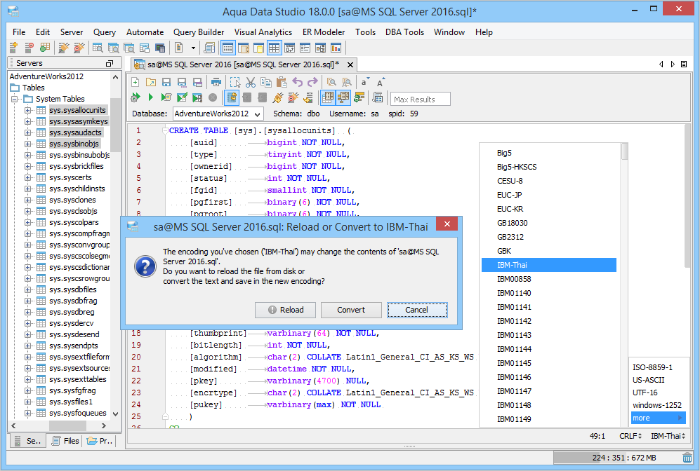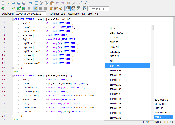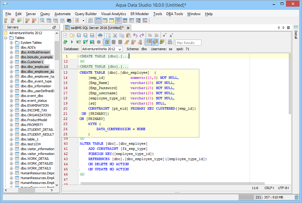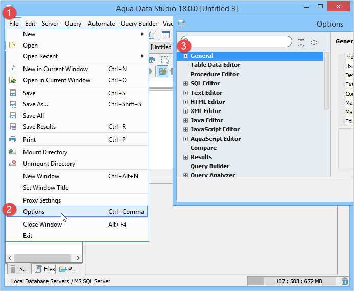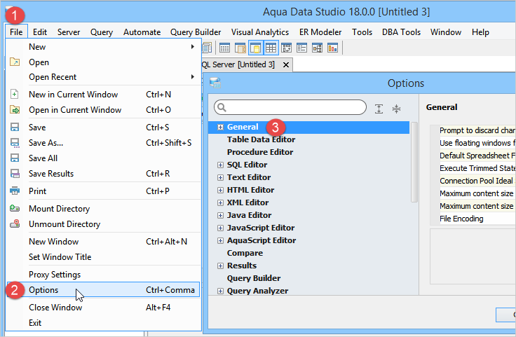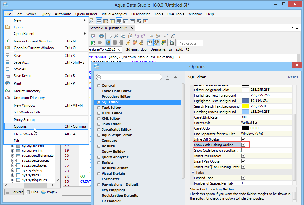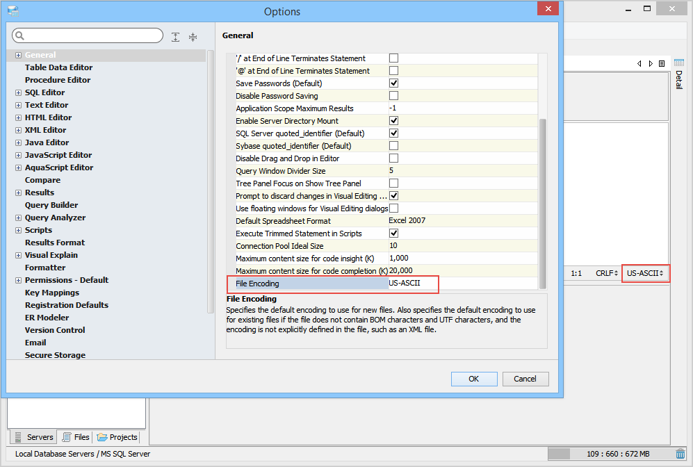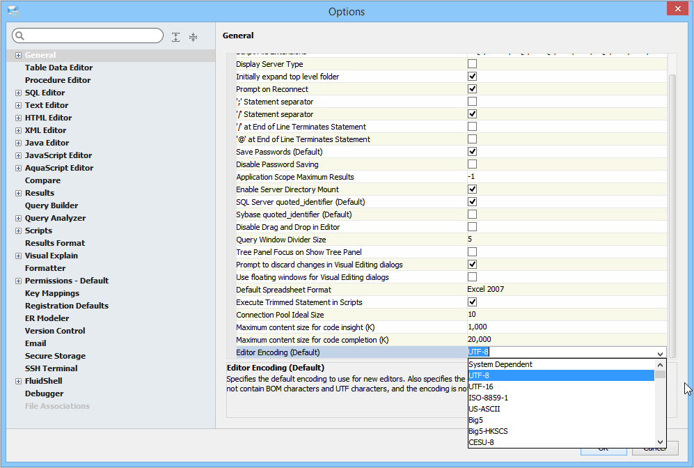By default, the maximum content size for code insight features is 1000 K. If that limit is exceeded, all the code insight features, such as automatic code folding and tag completion are disabled. The maximum content size for code completion is 20000 K. If that limit is exceeded, features, such as code-completion, punctuation completion, indent guides and brace highlighting are disabled. In both cases, Aqua Data Studio displays the currently configured size and the actual content size.