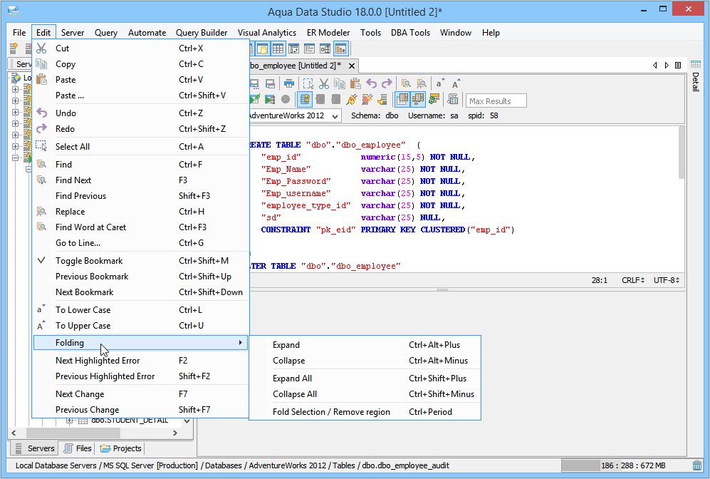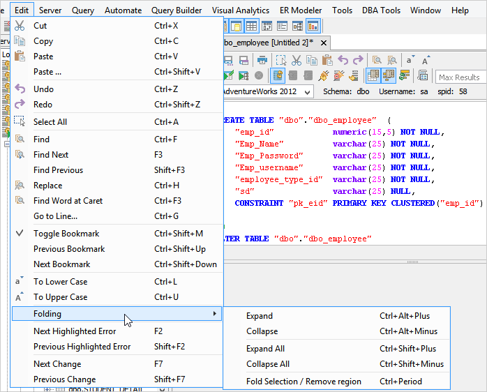 | Fold Selection / Remove region | Folds the entire selected code, even if the code folding setting is disabled. |